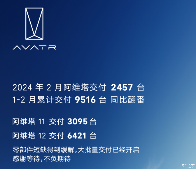 日前,阿维塔官方公布了2月销量成绩——共交付2457辆。1-2月累计交付9516辆,其中阿维塔11交付3095辆,阿维塔12交付6421辆。官方表示,零部件短缺得到缓解,大批量交付已经开启。据汽车之家了解,此前因为芯片短缺影响了阿维塔部分车型的交付。