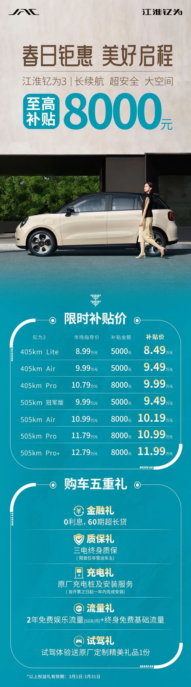 3月4日,我们从官方了解到,定位为纯电动小型车的江淮钇为3开启限时优惠,至高补贴8000元。补贴后售价为8.49-11.99万元。新车与欧拉好猫、比亚迪海豚等车型展开竞争。