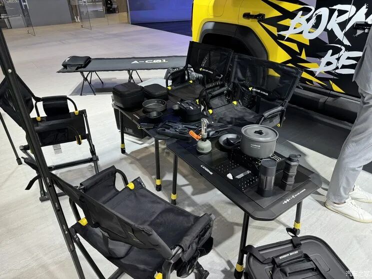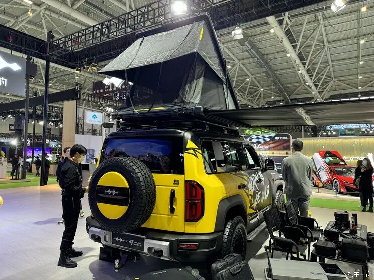 与Arcane Warrior打造的改装版主要展示户外露营的生活方式。它整车采用了Arcane Warrior品牌标志性的黑、黄搭配,在车身上喷绘了个性的标识。该车搭载了来自Arcane Warrior的车顶敞篷以及侧边天幕,现场还展示了Arcane Warrior品牌诸多露营装备。