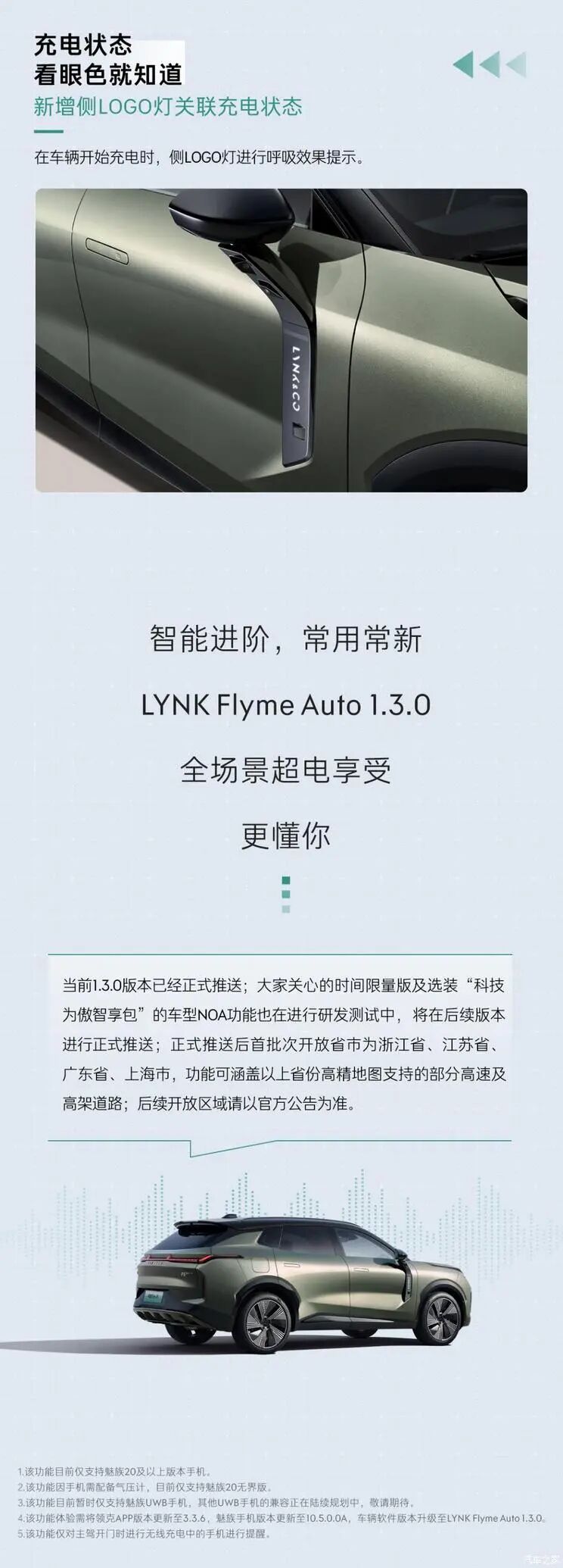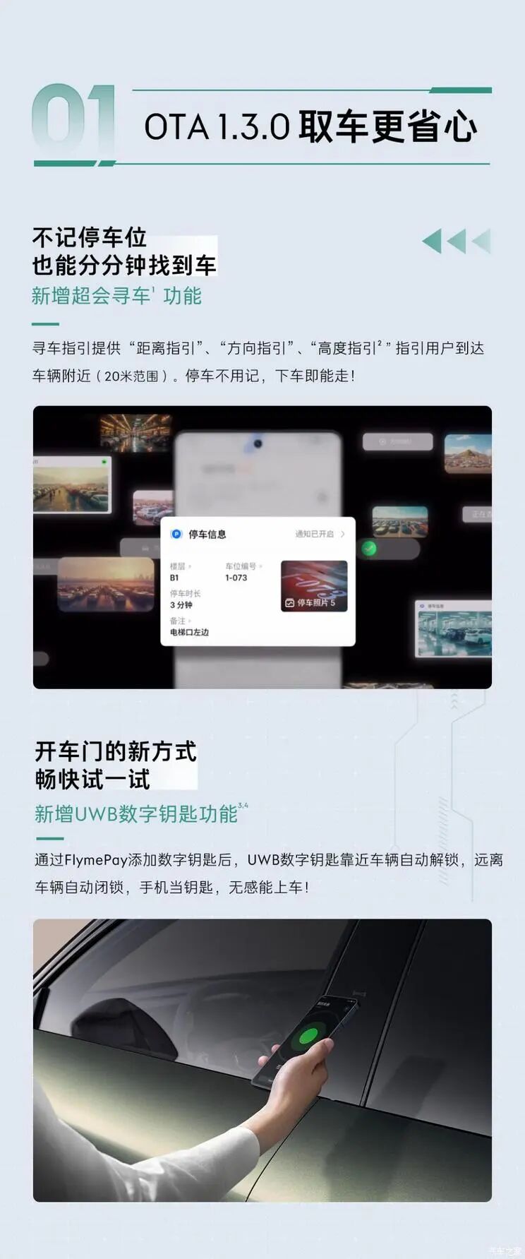 新增超会寻车功能:寻车指引提供“距离指引”、“方向指引”、“高度指引”指引用户到达车辆附近(20米范围)。新增UWB数字钥匙功能:通过FlymePay添加数字钥匙后,UWB数字钥匙靠近车辆自动解锁,远离车辆自动闭锁。