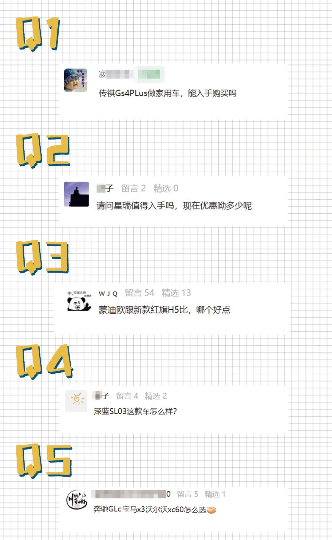 各位看官如有关于购车、用车等一切汽车相关的问题都可以私信或留言给我们,被选中的问题我们会私信告知您,此后会以文字形式集中回答!各位的问题,我们也会开放出来,大家可以一起讨论与回答~