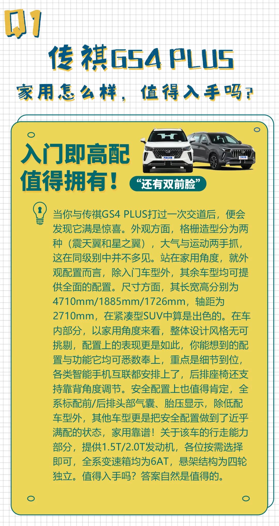 Q1,传祺GS4 PLUS家用怎么样?值得入手吗?双外观设计、优于竞品的尺寸、丰富的配置表现、强劲的动力……作为家用车,它定会让你满意。价格合适直接冲!