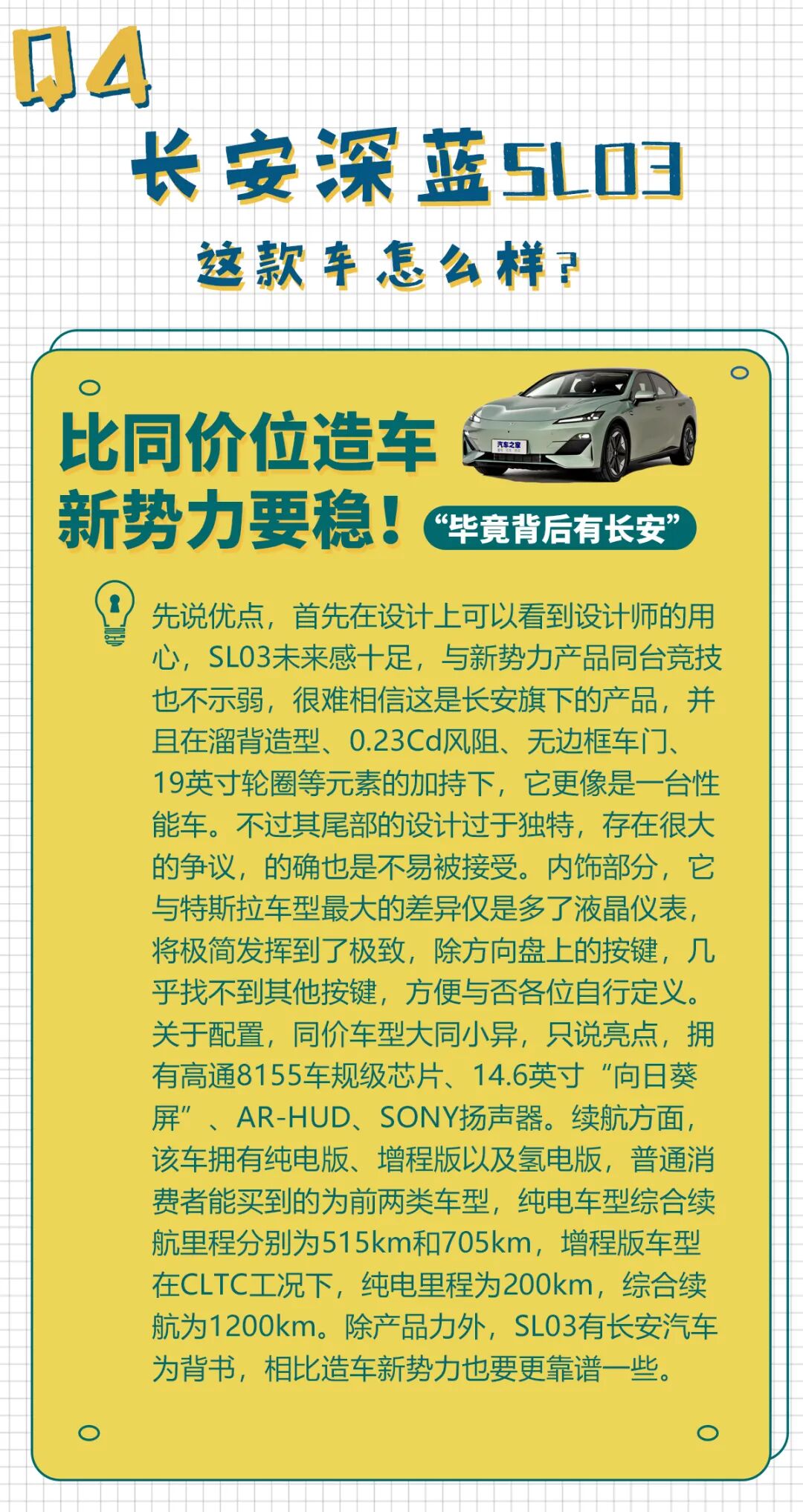 Q4,长安深蓝SL03这款车怎么样?同价位下,买它要比造车新势力车型靠谱些。产品力也是硬核,2900mm轴距、最大续航1200km、后驱……关键起售价仅16.89万元。