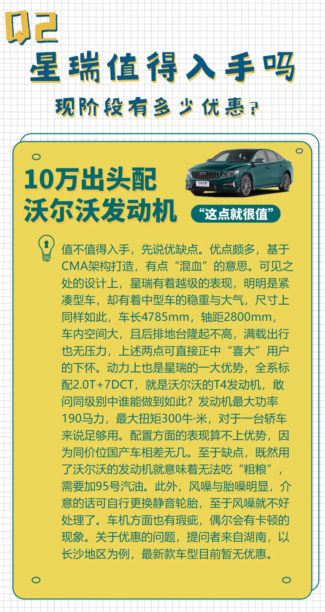 Q2,吉利星瑞值得入手吗?现阶段有多少的优惠?太值得了!沃尔沃2.0T发动机、2800mm的轴距、11.37万元的起售价,跨级体验有没有?至于优惠的话,新款车型刚完成上市不久,再加上车型的高热度,目前暂无优惠。