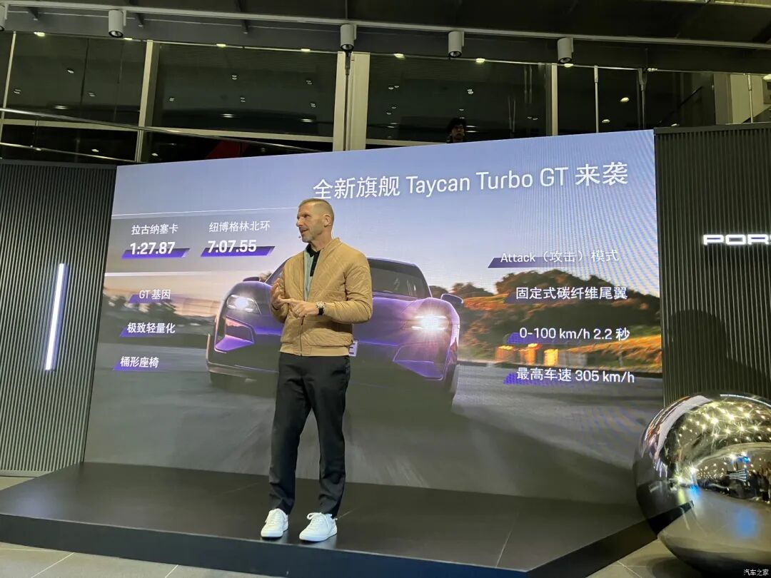 首先,新款Taycan Turbo GT在线上完成了首发,该车正是此前缔造纽北圈速7分07秒55原型车的量产版,该圈速比Taycan Turbo S快了26秒,相当于甩开了1.3km的距离。据悉,该车最大功率可达1108马力(815kW,超增压功率,持续2秒),峰值扭矩1340牛·米,极速可达305km/h,0-100km/h加速仅需2.2秒,在新型900A逆变器加持下,Attack Mode(进攻模式)还可在10秒钟内额外获得120kW的功率。