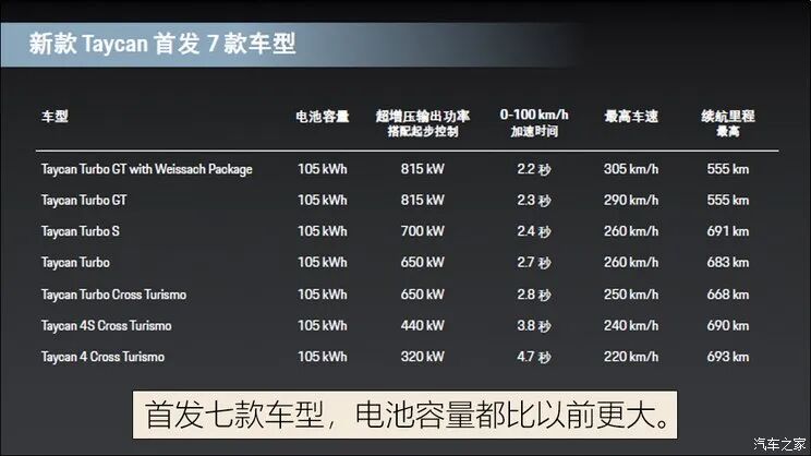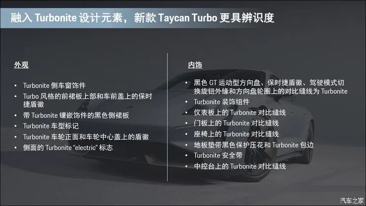 从下面的表格,能看出Turbo车型的一些特殊配置。下一页,我们将进入车内看看新款车型的内饰到底长什么样子。值得一提的是,中期改款保时捷Taycan在轻量化方面也下足了功夫,无论是车身材质还是电机等方面都进行了减重处理,因此整车质量减轻了15kg。