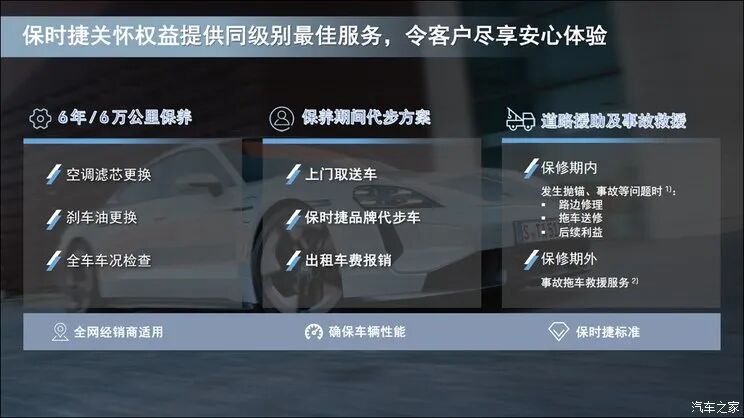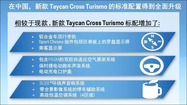 另外,首发的现场还公布了Taycan Cross Turisom车型的一些配置信息和售后信息,详情如下:
