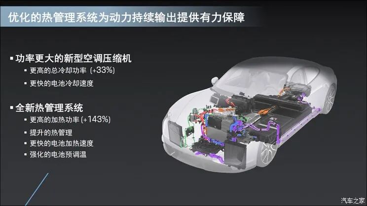 说到空调,新款Taycan针对了空调系统进行了优化,不管是冷气还是暖气的效能都有进步。