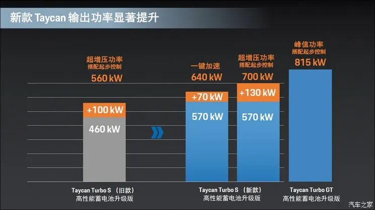 此外,新车针对电机也进行了升级,据悉电机重量减少了10kg。动力参数方面,新款Taycan基础版车型最大功率300kW,0-100km/h加速时间4.8s,WLTP工况最高续航678km;新款Taycan Turbo S车型最大功率700kW(超增压模式),0-100km/h加速时间2.4s,WLTP工况最高续航630km。