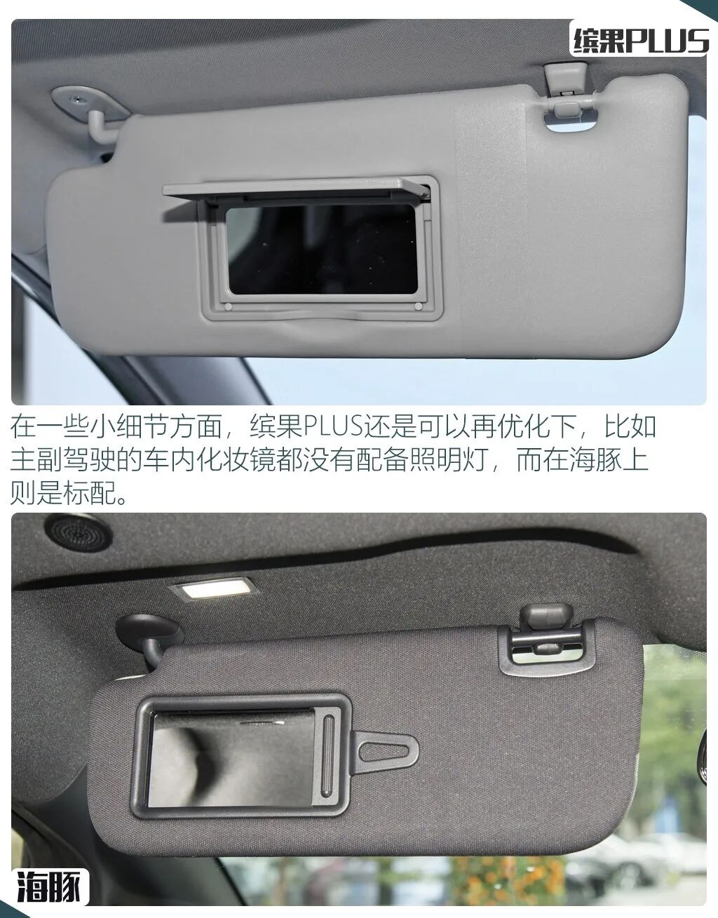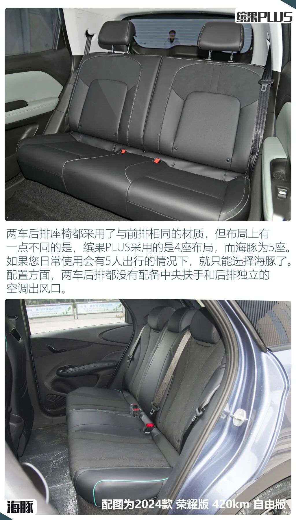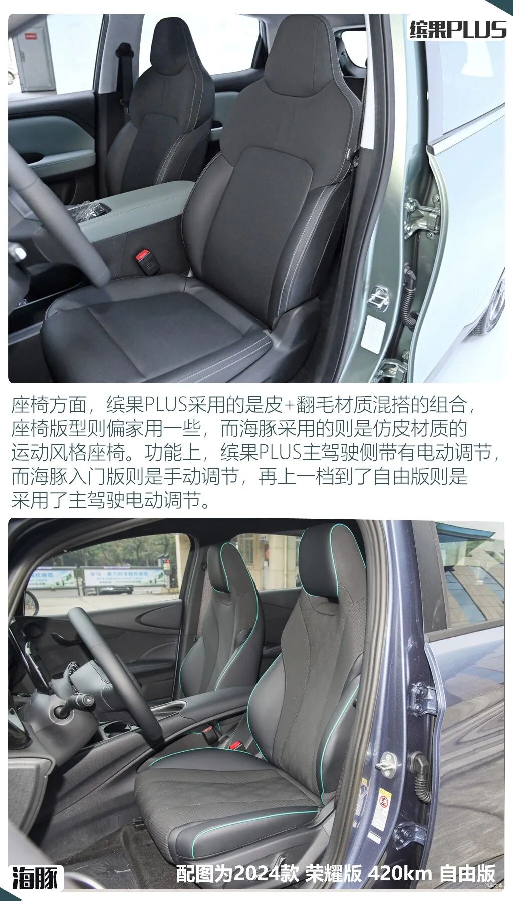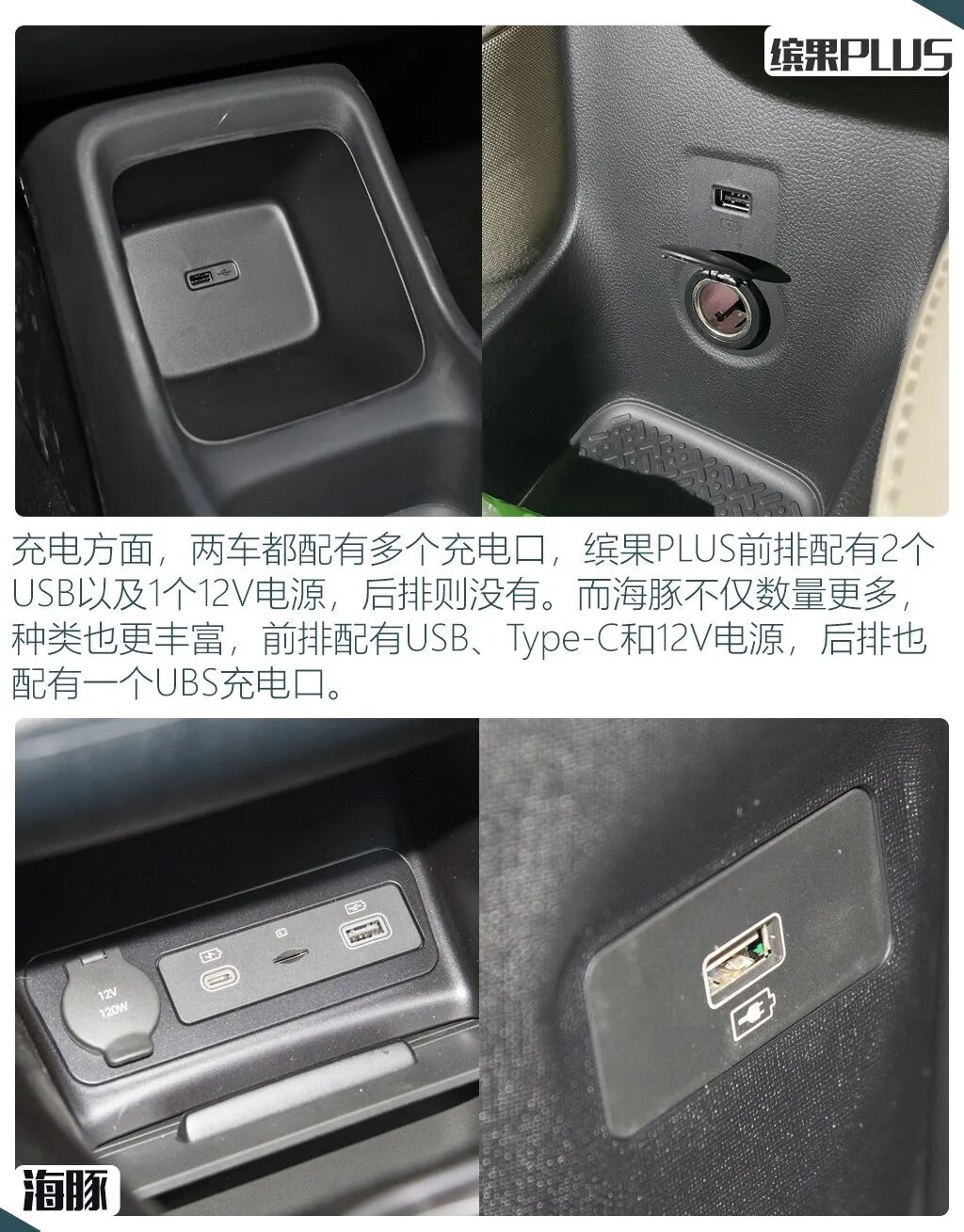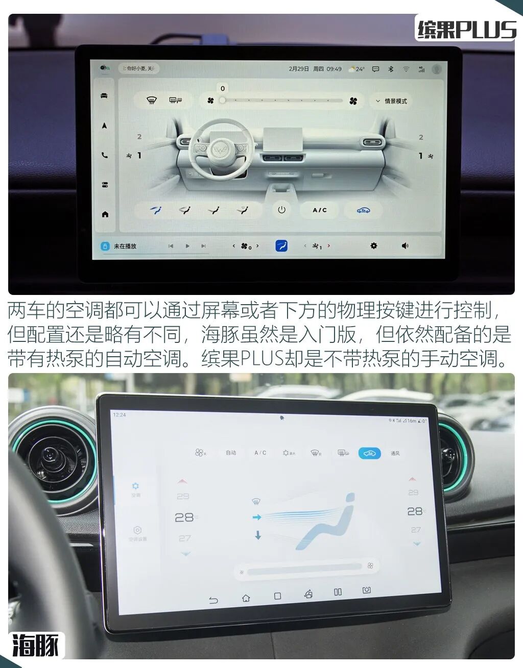 整个车内配置表现方面,两车还是有着一些细节上的区别,首先都采用了全液晶仪表+大尺寸中控屏的组合,但仪表尺寸缤果PLUS稍大,而海豚的中控屏尺寸领先,并且还带有旋转功能,车机系统方面,两车都带有语音控制等基础功能,缤果PLUS的优势在于支持可见即可说以及双区语音唤醒,而海豚的优势则在支持应用商店和WIFI热点。空调方面,海豚的适应面也明显更广,配备了带有热泵的自动空调,而缤果PLUS则是手动空调。