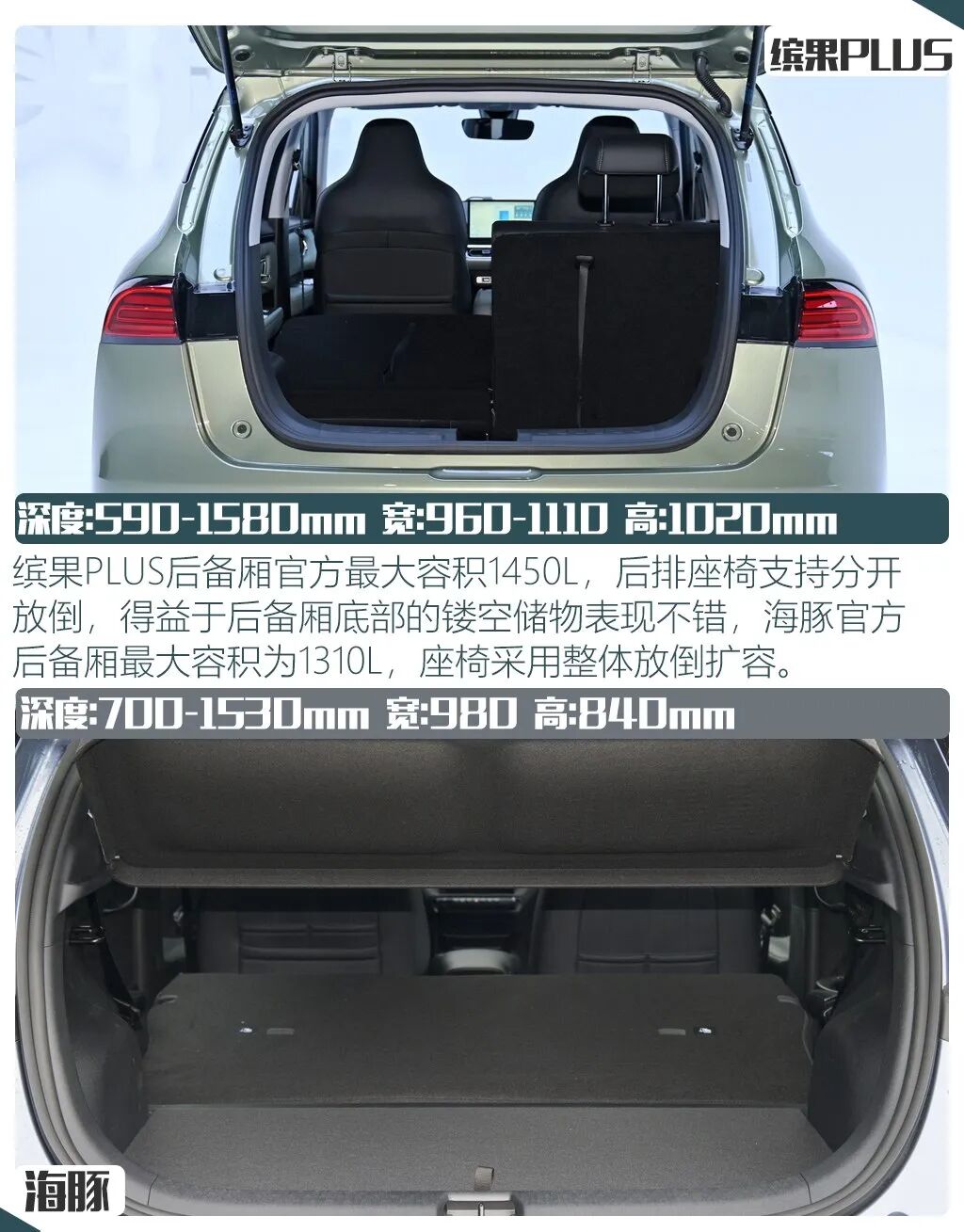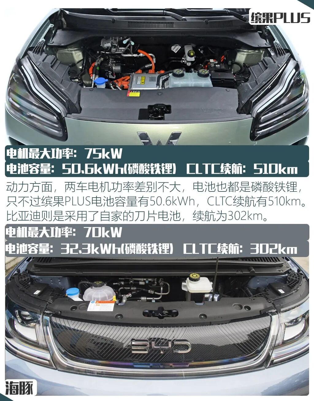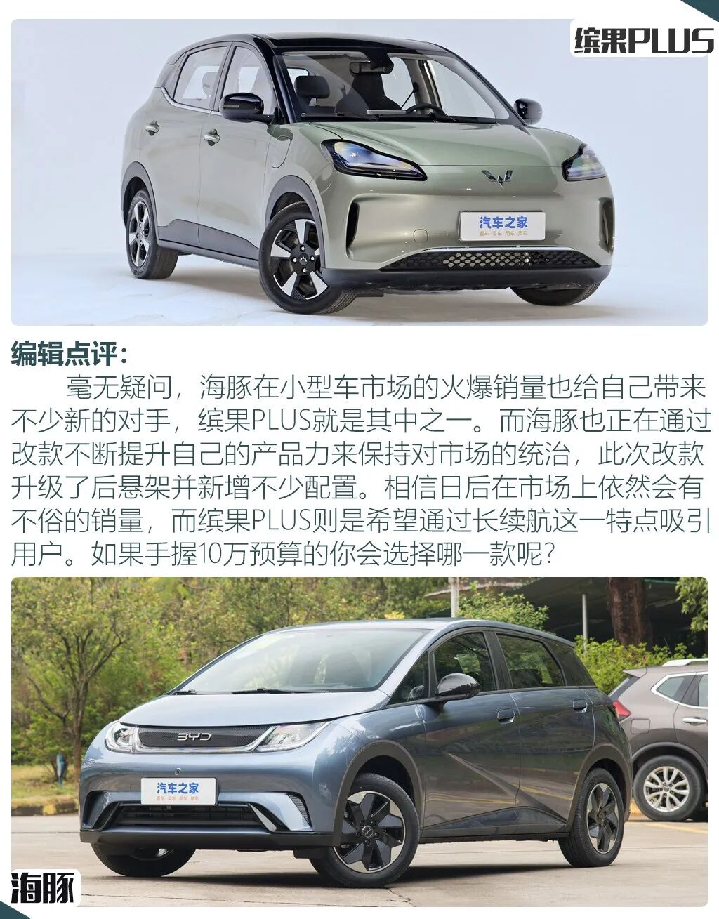 此次两款车型的对比可以说是一次小型车鸡头凤尾的对决,五菱缤果PLUS作为旗舰车型,最大的卖点相信就是它510km的续航,但只推出4座版本也让不少消费者有些纠结,而比亚迪海豚虽然是最低配,但全系升级后提供的独立后悬架也让车辆的行驶质感又有了一定的提升,同时在此次比较中,它的配置表现甚至在一些地方比缤果PLUS更好,所以当手握10万预算时,你会在它们两者间选择谁呢?