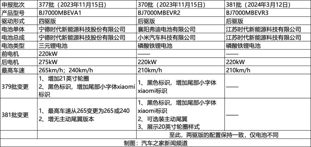 在2023年11月15日公布的第377期公示中,小米SU7首次曝光,共申报了两款车型,分别为型号为BJ7000MBEVA1的四驱版和型号为BJ7000MBEVR2的后驱版。四驱版前后电机功率分别为220kW和275kW,搭载宁德时代电池。后驱版电机为220kW,搭载弗迪电池。