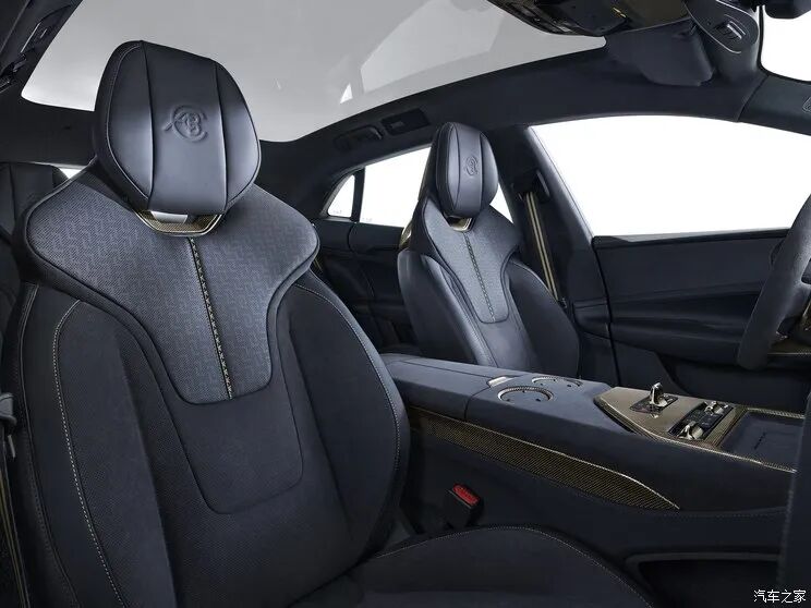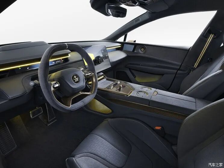 内饰方面,路特斯EMEYA兼顾了科技感和运动属性,黑金版与外观相同,均采用了黑色与金色的颜色搭配,全车包裹了Alcantara材质面料,并搭配黑金碳纤维方向盘,全车内部的碳纤维面板则采用黑金配色,安全带也使用了黑黄色条纹拉花,另外整车还采用了特殊的金色缝线设计,细节之处尽显高雅魅力。