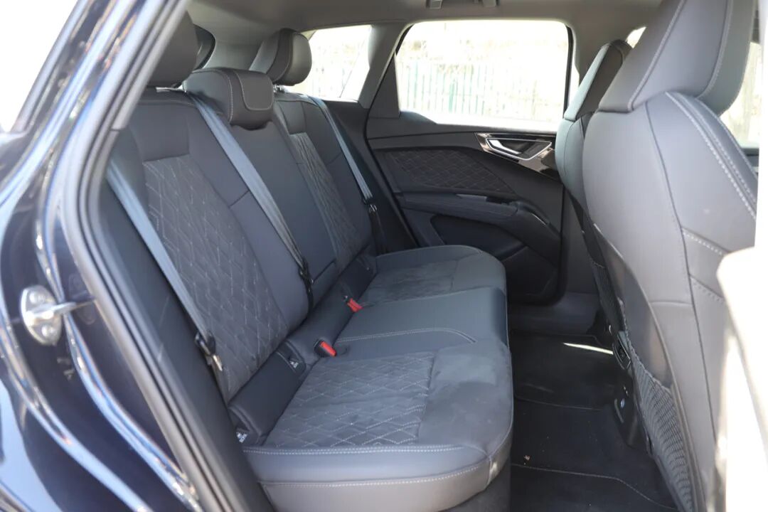 奥迪Q4 e-tron后排座椅椅背角度和坐垫长度都表现不错,腿部空间应对日常家用完全没有问题。后排配有出风口、温度调节、充电口、和12V电源,功能比较齐全。唯独不太满意的要数后门板的材质用料。作为一款30万左右的豪华品牌车型,门板上的硬塑料占比偏多了。