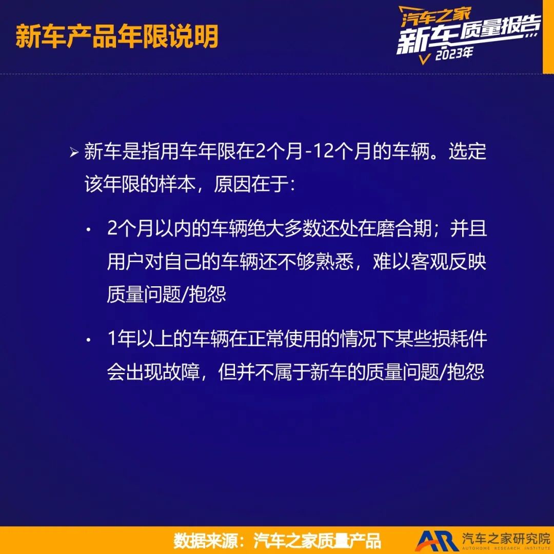 在文章开始前,大家有必要了解一下我们的规则,除了查看我们之前的《总榜》文章外,大家也可以看一下上图中我们对新车调查样本规定的细则,为什么要选定2-12个月的新车作为样本。简单来说,汽车之家质量评价是基于真实车主对于拥车期2-12个月内车辆质量情况的调研,通过汽车行业内通用的计算方法和标准分析评定汽车质量情况的产品。列一个我们的采集数据或许更直观。2023年全年,我们共收集了21877个样本。车辆问题分为九大分类,包含有车身外观、电子设备、内饰、行驶过程、功能操作等,共有超过200个二级指标展示给消费者进行确认。