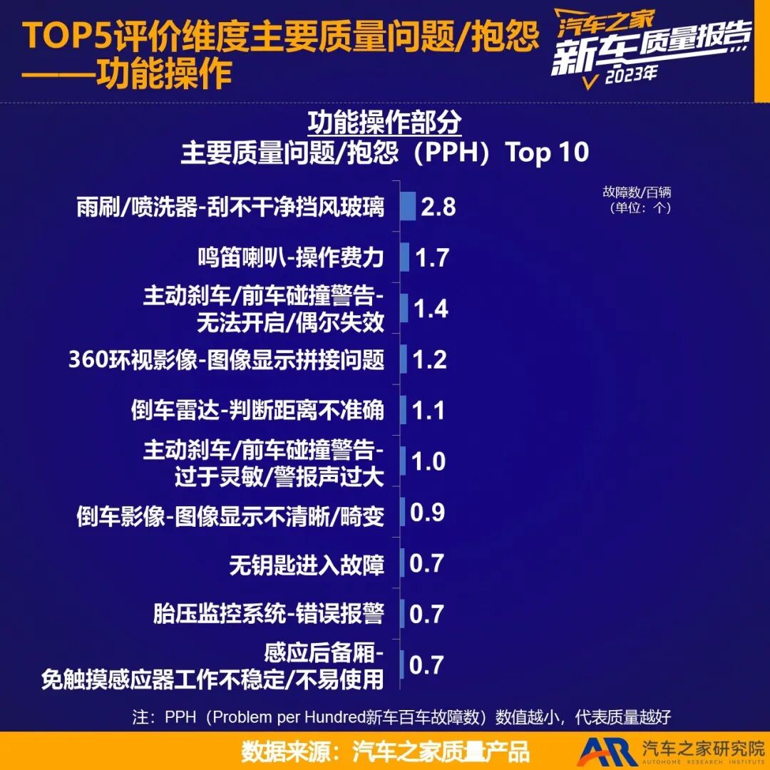 功能操作方面,集中反馈的问题并不是很多,主要问题是雨刷器刮不干净、喇叭操作费力、主动刹车偶尔失效。雨刷刮不干净,更多是雨刷配件的问题。雨刷属于易老化的橡胶制品,遇到刮不干净的情况时请及时更换。按喇叭费劲同样是因为新能源车一些独特的方向盘设计导致。AEB是2023年大家争议比较多的话题,这就是排名第三的主动刹车失效的问题,AEB是一个极其复杂的功能,目前这一功能实现的前提条件较多,比如时速、现场情况等。车企应当就该项功能为消费者做出更多的说明和指导意见,同时,有功能和好用仍然有很大的差距,消费者需要的是能够切实保证安全,而不是给消费者增添麻烦。