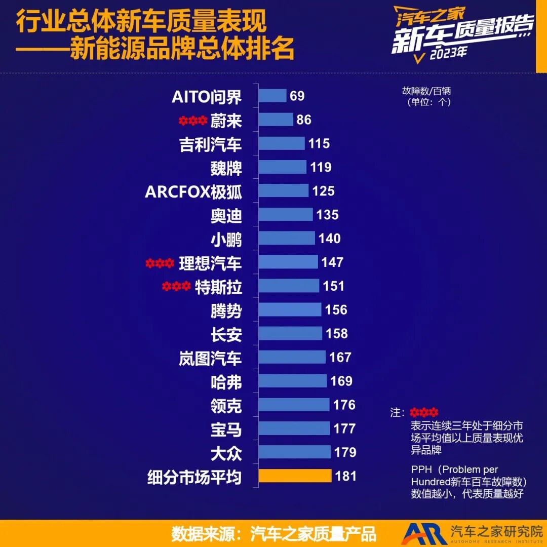 值得一提的是,蔚来、理想、特斯拉连续三年处于细分市场平均值以上,质量表现稳定。AITO问界、小鹏、长安、宝马等品牌连续两年处于细分市场平均值以上。2023年新增处于平均值以上的品牌包括吉利、魏牌、极狐、奥迪、腾势、岚图、哈弗、领克、大众。而去年上榜的埃安、五菱、比亚迪今年没能杀入总体排名榜单。