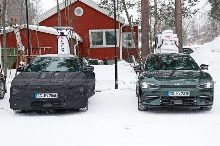 来看谍照,虽然新车还包裹着厚重的伪装,不过测试车与现款起亚EV6摆放在一起,倒也使得变化显而易见。可以看到新车将会换装全新的灯组设计,相应的下包围也将会有所升级,预计类似的变化也将会出现在新车的尾部。