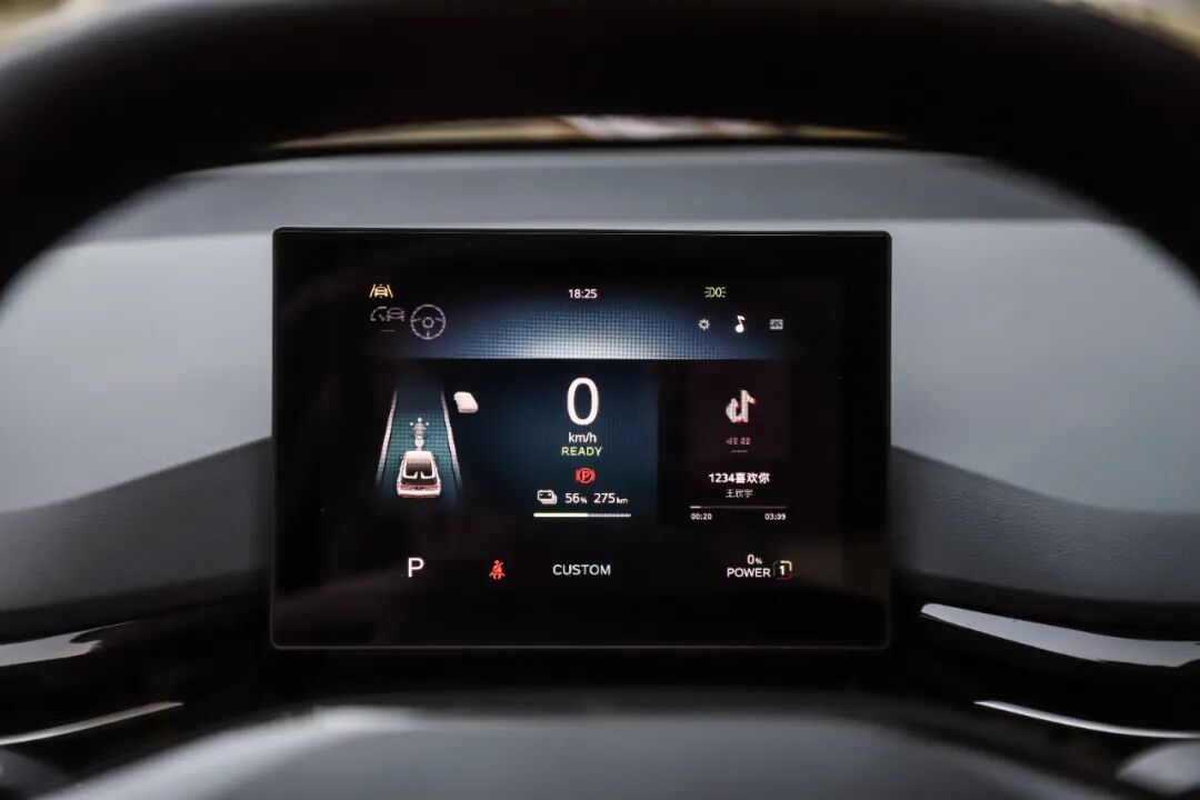 7英寸液晶仪表采用无遮罩设计,小尺寸液晶仪表加无遮罩设计如今也算是新能源车型的一个设计趋势。MULAN的液晶仪表可显示行驶数据、驾驶辅助、多媒体、导航路线、驾驶模式、动力输出、轮胎压力等信息,尺寸虽不大但显示内容足够丰富。
