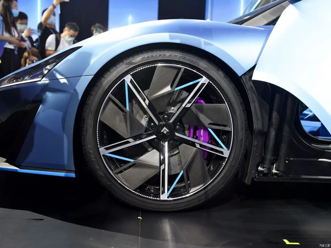 来到侧面,大轮圈还不是最醒目的设计,更抢戏的是轮腔气流通道的造型,这同样很超跑。轮胎尺寸方面,前轮245/35 ZR21,后轮305/30 ZR21。对了,据官方介绍,Hyper SSR的轮胎是专属定制的,采用了低生热配方和低膨胀率设计等。