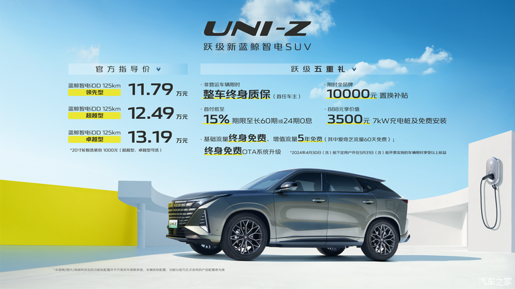 3月28日,我们从长安汽车官方了解到,旗下紧凑型SUV——长安UNI-Z正式上市,新车共推出3款配置,售价区间为11.79-13.19万元。UNI-Z是长安UNI序列的最新力作,该车以“Z”命名,“Z”本身就具有未来、科技的符号印象,同时也与“最”和“Z世代”等产生关联。同时,该车将搭载长安最新的蓝鲸智电iDD插电混动系统,纯电续航为125km。此外,长安汽车还针对UNI-Z限时推出五重跃级大礼。跃级无忧礼:非营运车辆限时整车终身质保(首任车主);跃级换新礼:限时全品牌置换补贴10000元;跃级金融礼:首付低至15%,期限至长60期;或24期0息;跃级充电礼:888元享价值3500元7kW充电桩及免费安装;跃级智联礼:基础流量终身免费,增值流量5年免费(其中爱奇艺流量60天免费);终身免费OTA系统升级。(以上权益仅限4月30日(含)前下定用户并在5月31日(含)前开票实销的车辆限时享受。)关于新车详细售价,见下图: