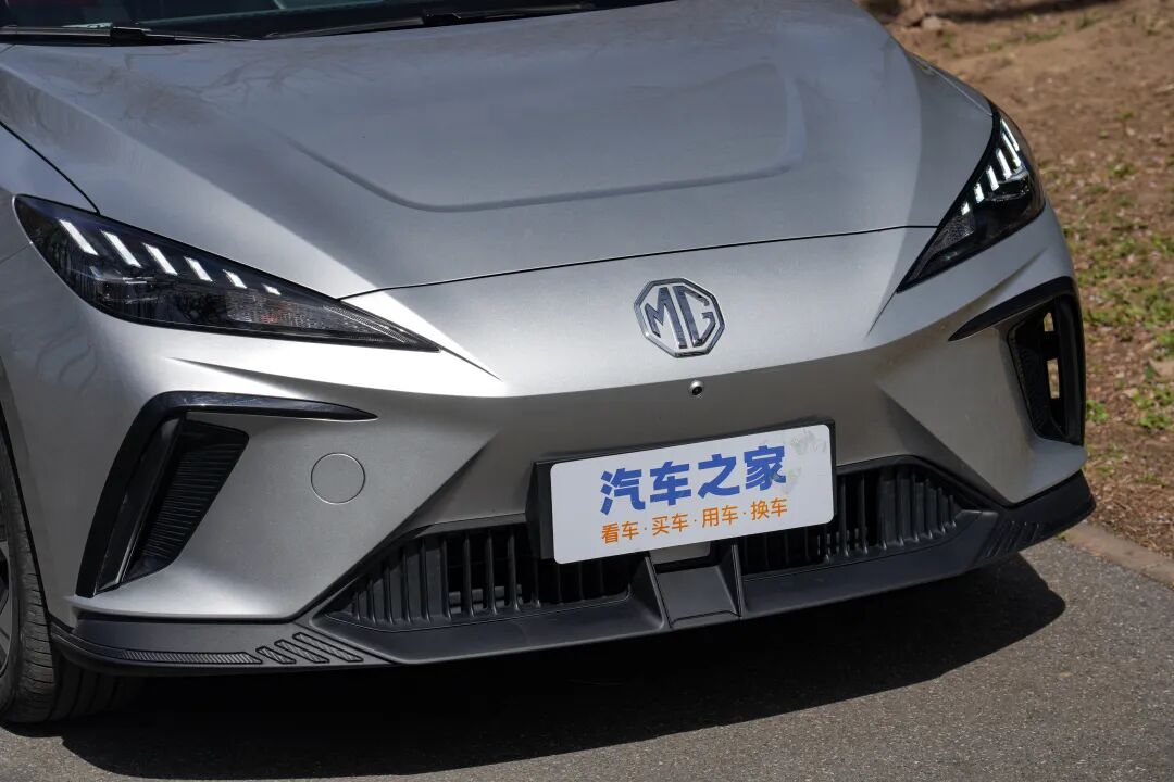 车头部分处处都在彰显运动与激进,“发动机舱”盖上方的凹陷设计、前包围两侧巨大的进气口装饰件以及黑化的前铲,这在同级别电动车中可不多见。当然了,MG4 EV两侧进气口是真实存在的,也具备实际作用。