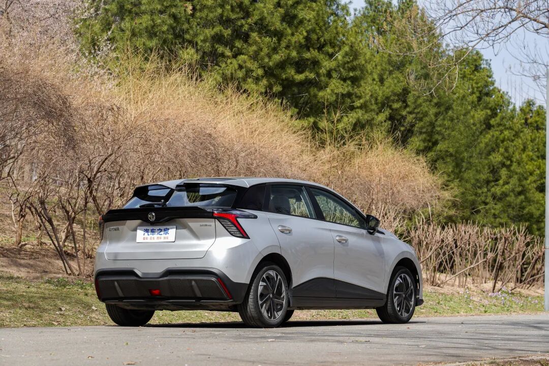 MG4 EV的车尾设计是高光点,层次分明且有点两厢半的意思,相比车头更为战斗。镂空分体式扰流板造型十分夸张,够帅,如果按照造型来看的话,贯穿式尾灯上方也算是一个扰流板。此外,能提升运动感的还有底部包围的扩散器。就外观而言,MG4 EV足够出彩,路上的回头率超高。