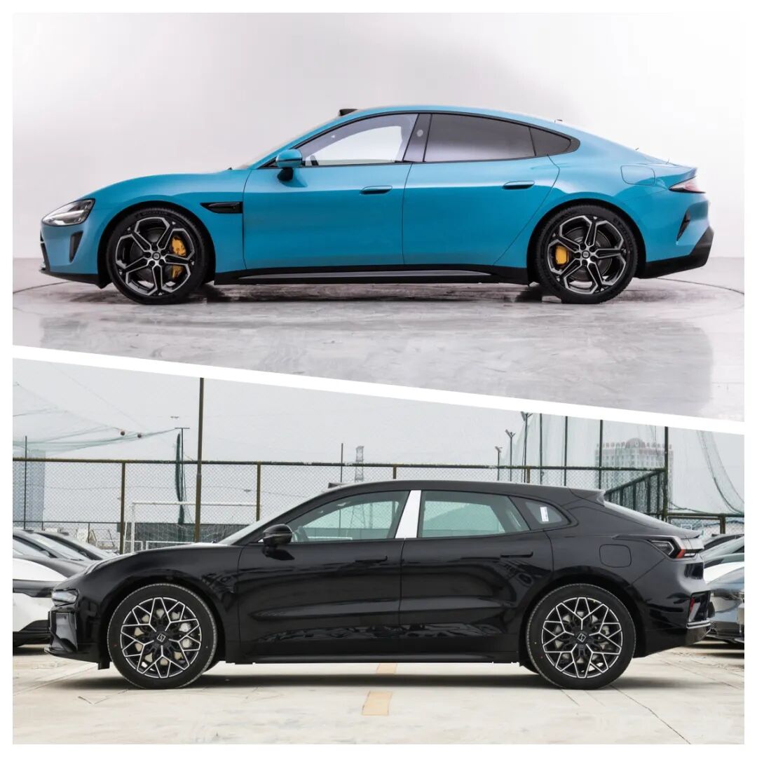 小米SU7有着3倍轮轴比、2倍轮高比和1.36倍宽高比营造出运动比例,用28°前风挡+17°溜背车尾+G4连续曲线营造出动感轮廓;极氪001的设计更是久经市场考验,如今更加偏向001 FR版的前脸,在细节之处进行了进一步雕琢。