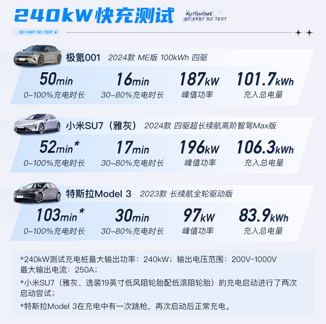 充电表现上,得益于800V平台的运用,无论是小米SU7还是极氪001都有着非常突出的表现,峰值功率分别达到196kW与187kW,30-80%充电时长均低于20分钟,0-100%充电时长更是低于1小时。而在480kW超充测试中,小米SU7更是实现了306kW的最大功率,10-80%用时仅为19分29秒,面对长距离补能需求时可以极大降低时间成本。