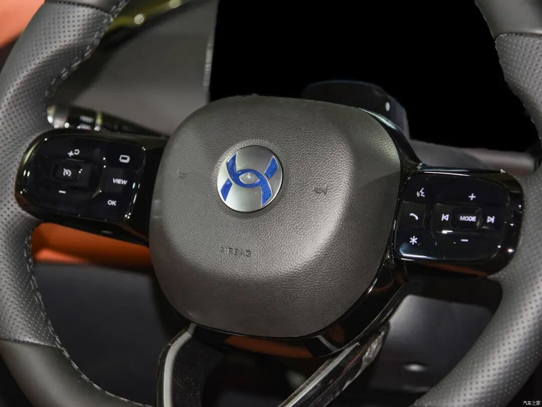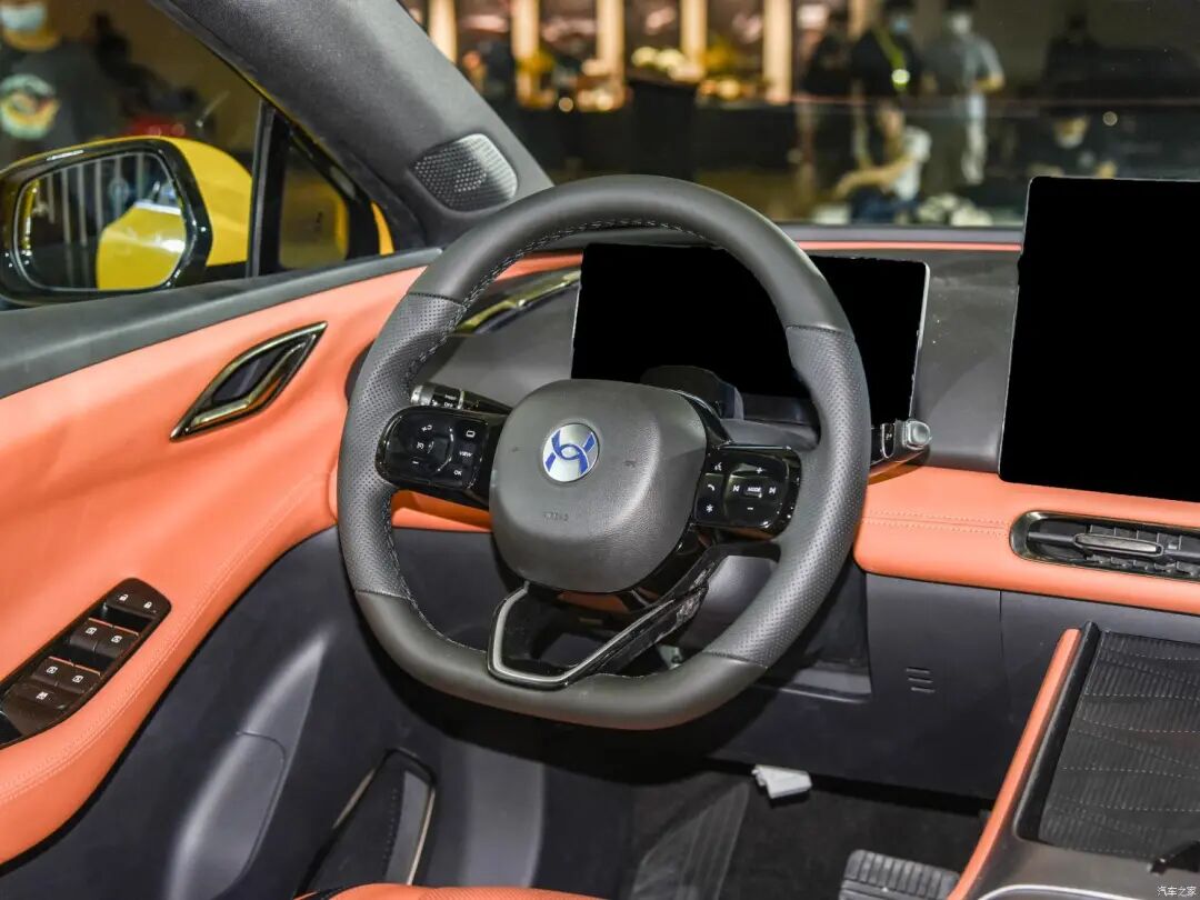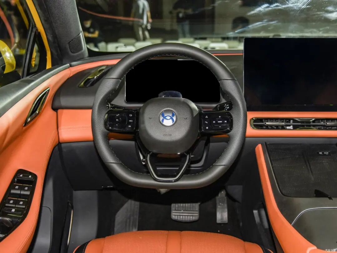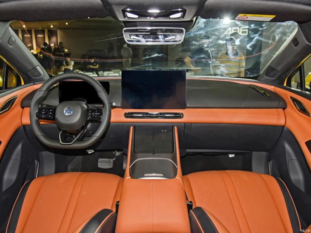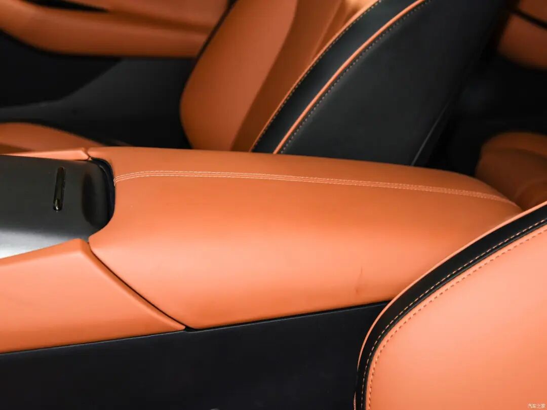 在用料方面,可以看到合创A06使用了棕色的皮质包裹,看上去高级感还是不错的。另外,新车采用一体式的运动座椅,乘坐舒适性表现良好,且具备一定的支撑性和包裹性,前排座椅还具备电动调节功能。