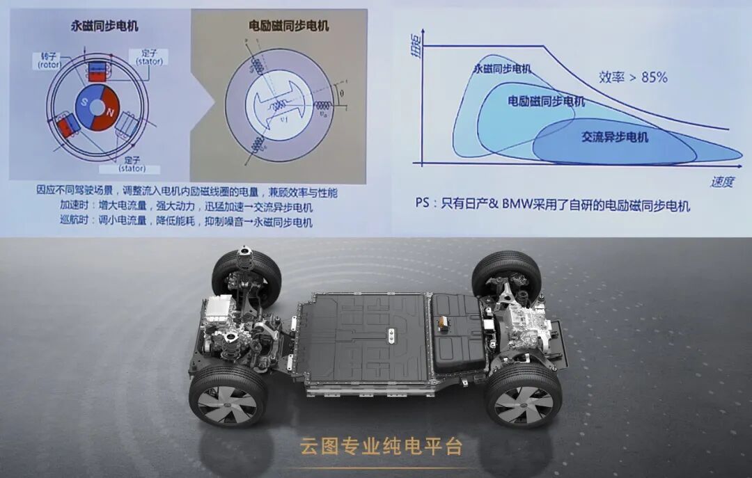 永磁同步电机以及交流异步电机都有较为明显的优势和不足。永磁同步电机效率高、体积小、功能密度高,但是转速低、高速效率低、高温时有退磁风险,市场上强调经济性/续航的产品基本都采用永磁同步电机。
