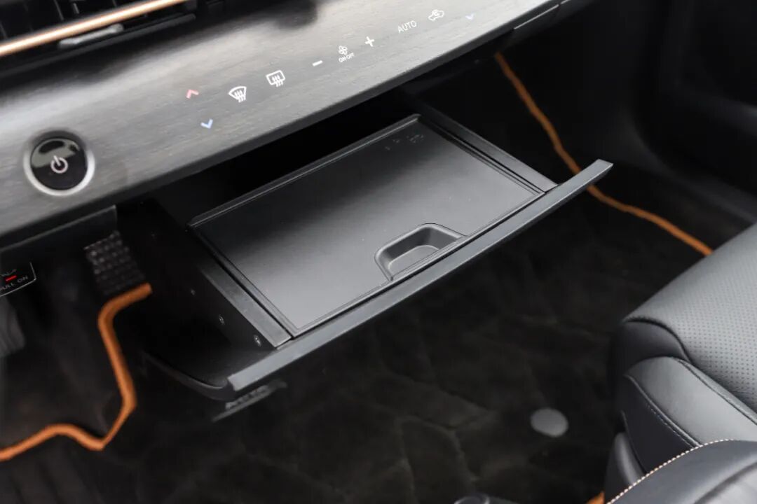 除了电动调节的中央扶手,中控台隐藏的储物格也是展现新意之处,储物格通过中央扶手上的按键控制,需要注意的是开启后副驾驶要注意不要被其磕碰左腿。