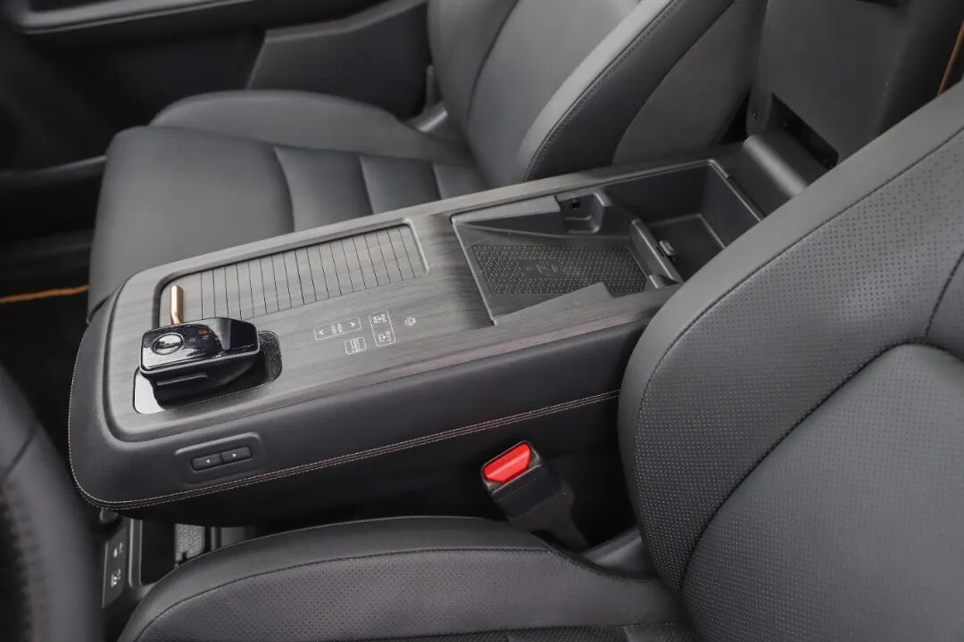 中央扶手可以电动调节前后位置,不同体型的人都能够找到舒服的换挡位置,而且当有需要时将扶手移动至最后会更方便从副驾驶侧下车。电动调节牺牲了扶手箱空间,掀开扶手内部只有一个小储物格和手机无线充电面板。