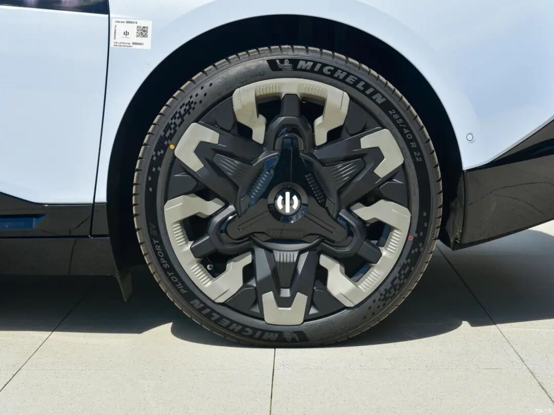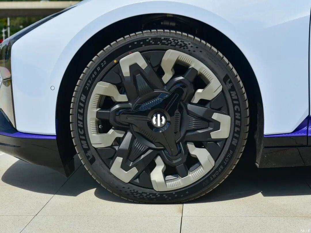 22英寸的轮圈也是吸引眼球的部分,它有着造型复杂的轮毂罩,除了造型更好看之外,磕碰的时候更换成本也更低,轮胎部分选择了米其林Pilot Sport EV。
