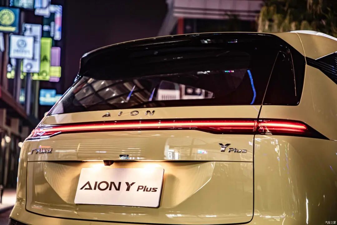 车尾是AION Y Plus最大的变化点,简约又不失设计感。官方称之为“天际线横贯式尾灯”点亮后很有辨识度,而造型设计上厂家也打趣说这是与500万内最好奶爸车的同款尾灯。