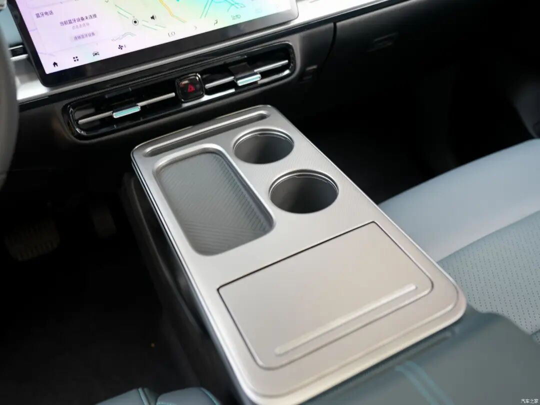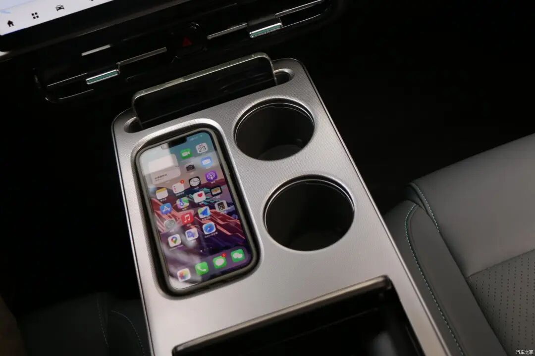 至于取消旋钮换挡机构后,腾出来的空间则被设计出更大的储物空间,比如可以放两台手机(横立和竖卧),其中竖卧的手机槽支持无线充电功能。