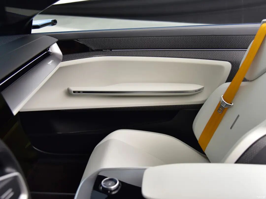 实拍车型座椅采用2+2布局,前排座椅采用白色一体式设计,配合上亮橙色安全带,更显个性一面,此外在用料上,新车延续Polestar品牌一贯的环保主题,大量软性覆盖材质均由再生聚酯制造。