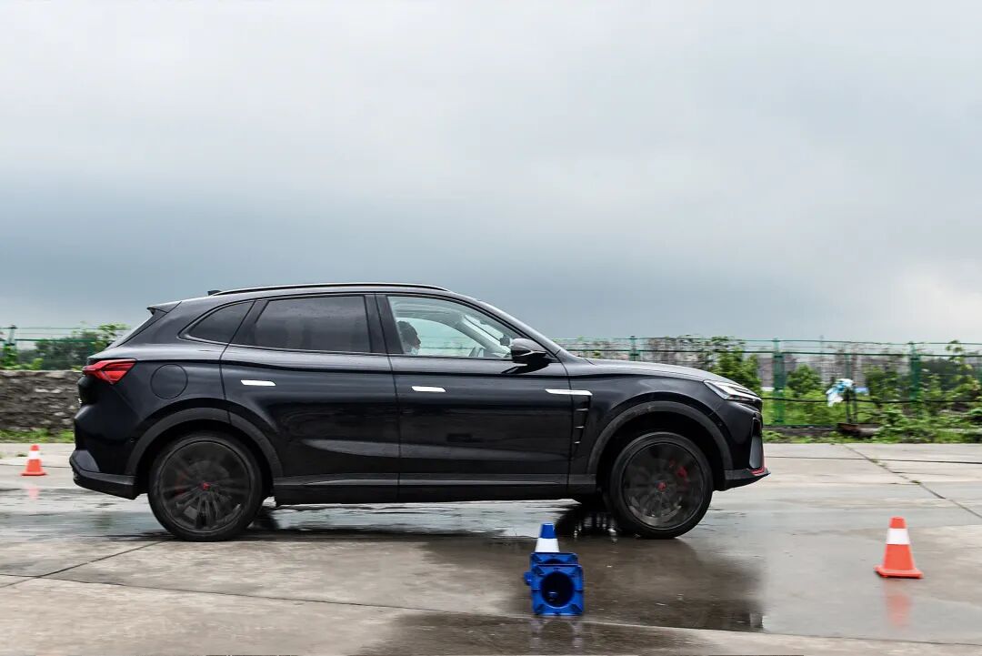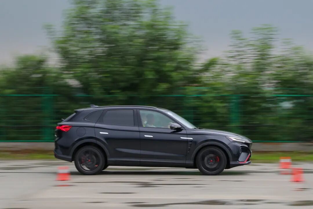 绕桩与8字环绕环节,考验车辆悬架的支撑性与转向精准性,前面也说到了,MARVEL R前悬架调校偏硬。在连续绕桩时悬架可给到车身不错的支撑力,开起来还是很容易控制的,有一丝丝运动气息。快速过桩时,车尾循迹性表现也说得过去,并没有因为2800mm的轴距而影响车辆整体性。不过,出于场地因素,即便是配备了米其林浩悦4轮胎,速度稍快的话,还是会有些许侧滑产生。但也没必要为此过分担心,因为ESP会立即介入,响应速度非常可观,一番修正过后,车辆便可按照你预设的线路继续前行。
