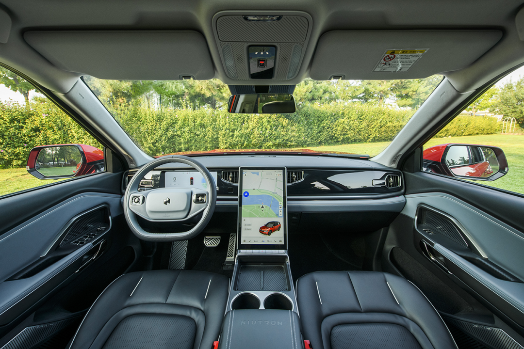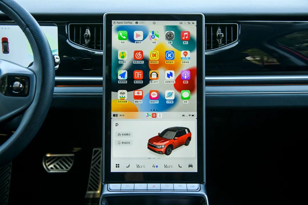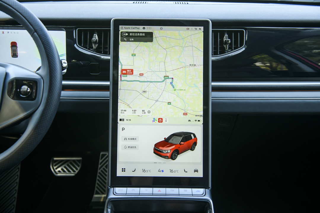 15.6英寸中控屏内置6颗线性马达,当用户进行触控操作时,可通过屏幕内的线性马达向手指传递振动反馈,提升了盲操作时的使用体验。在连接CarPlay之后,中控屏可实现NIUTRON OS与CarPlay同屏显示,通过CarPlay可以实现导航、在线音乐等功能,同时,在屏幕的下半部分则可以使用NIUTRON OS来调节车辆空调、驾驶模式、辅助驾驶等选项,两者独立运行互不干扰。此外,对于非iPhone用户来说,HiCar/CarLink手机互联也均支持无线连接。