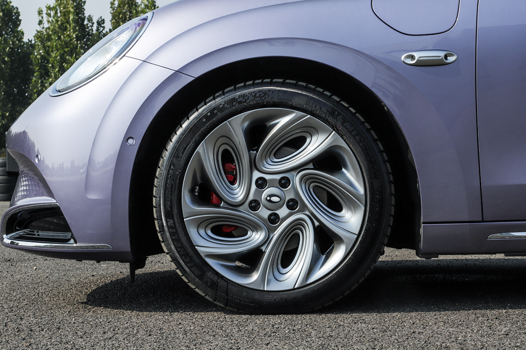 圆润的灯组造型很有复古范儿,在阳光的照射下,灯组内部结构如钻石般璀璨,高级感一下就上来了。19英寸“猫爪仿生”轮圈延续了欧拉家族的经典特征,内部的刹车卡钳采用红色涂装,搭配米其林Pilot Sport EV系列高性能轮胎,进一步提升了运动感。