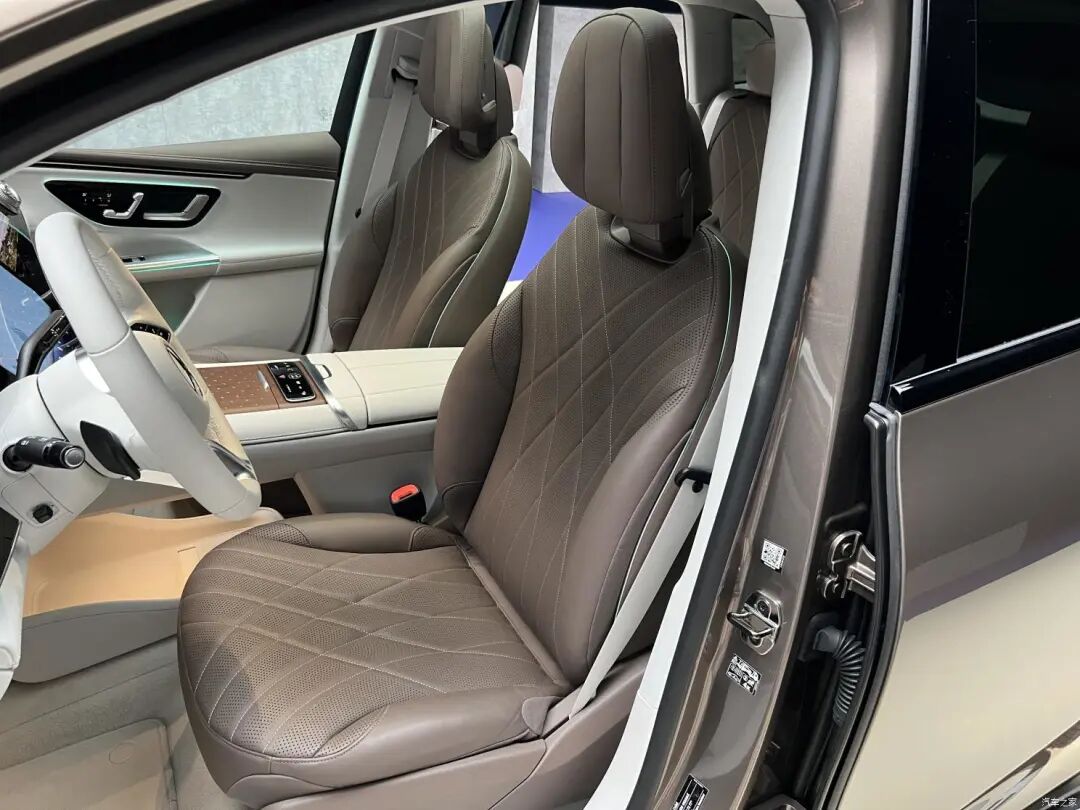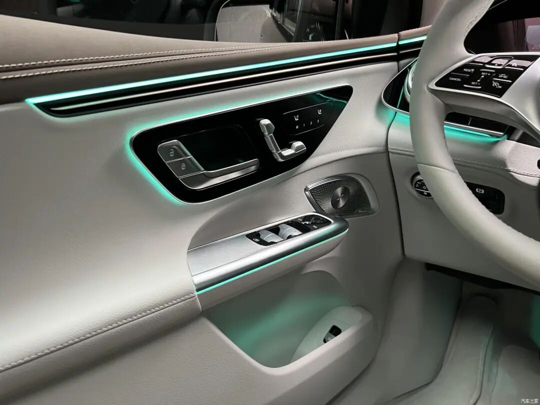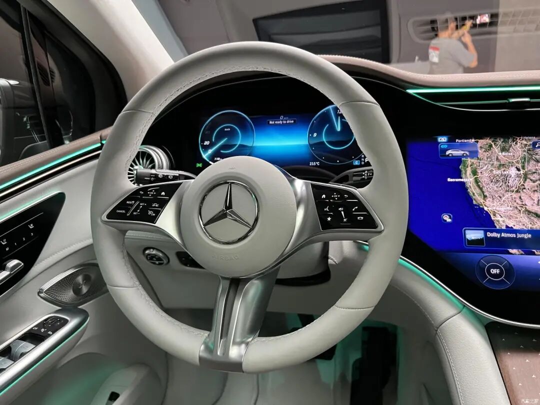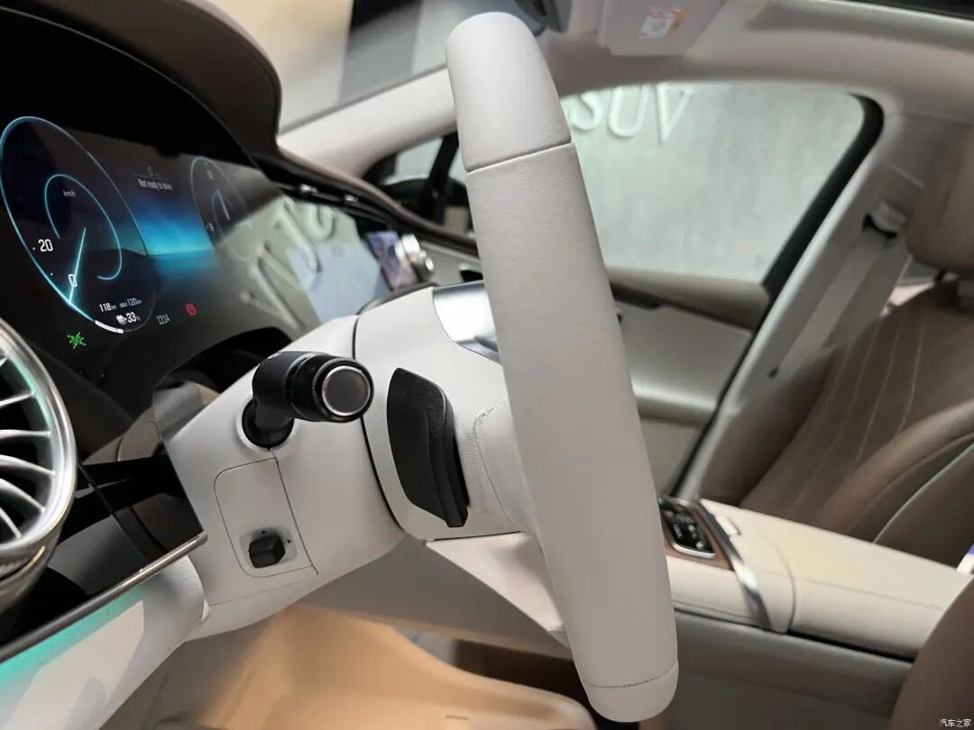 三辐白色真皮方向盘和EQS上的样式一致,两侧的多功能按键为触摸式设计,还具有电动调节功能。