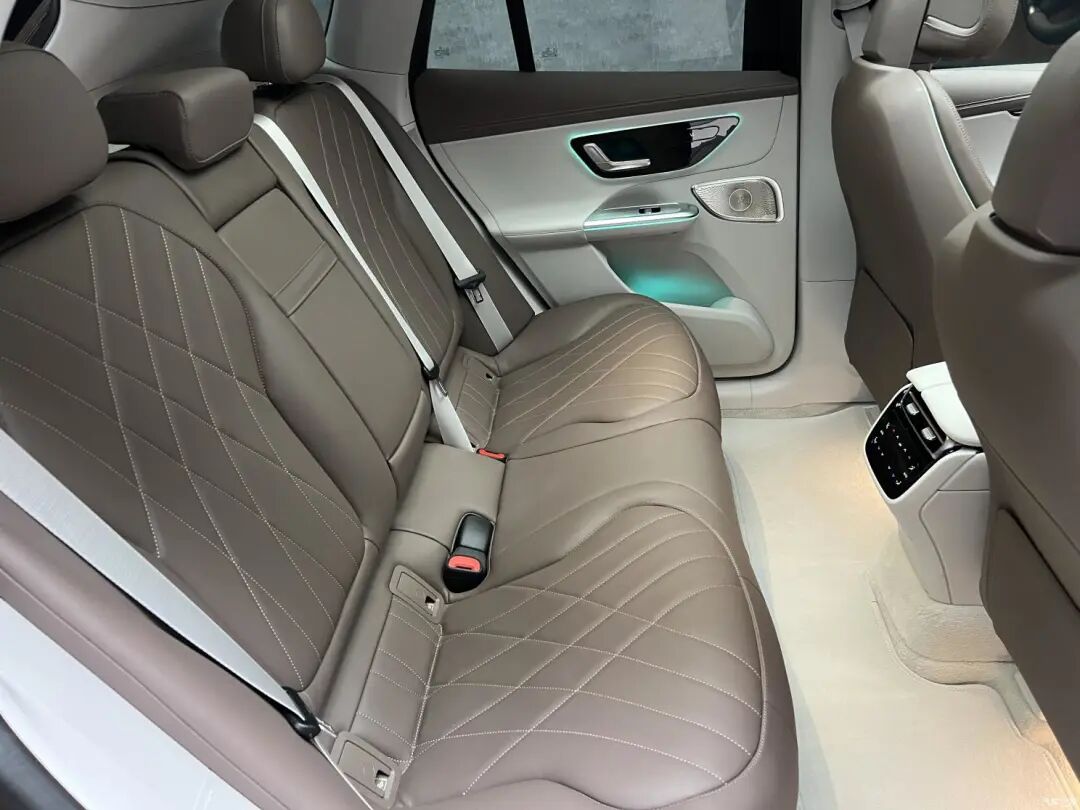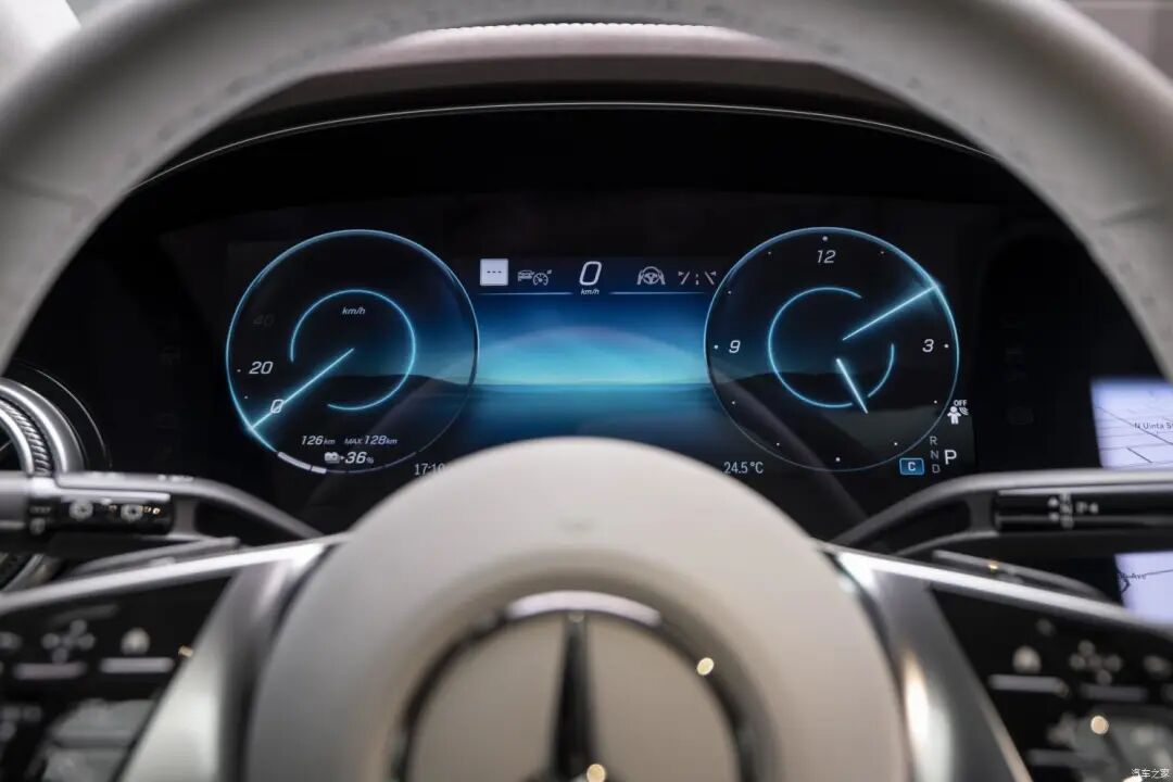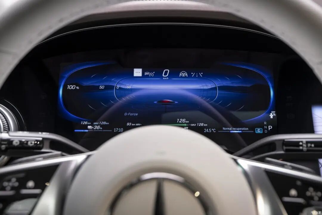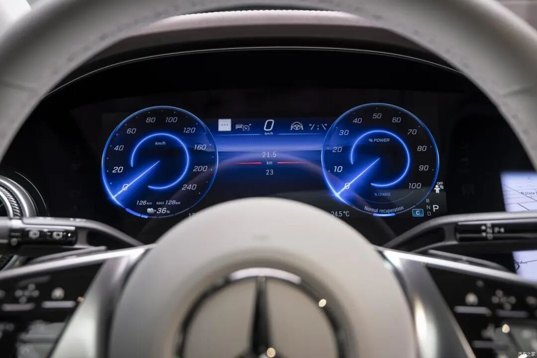 三辐白色真皮方向盘和EQS上的样式一致,两侧的多功能按键为触摸式设计,还具有电动调节功能。