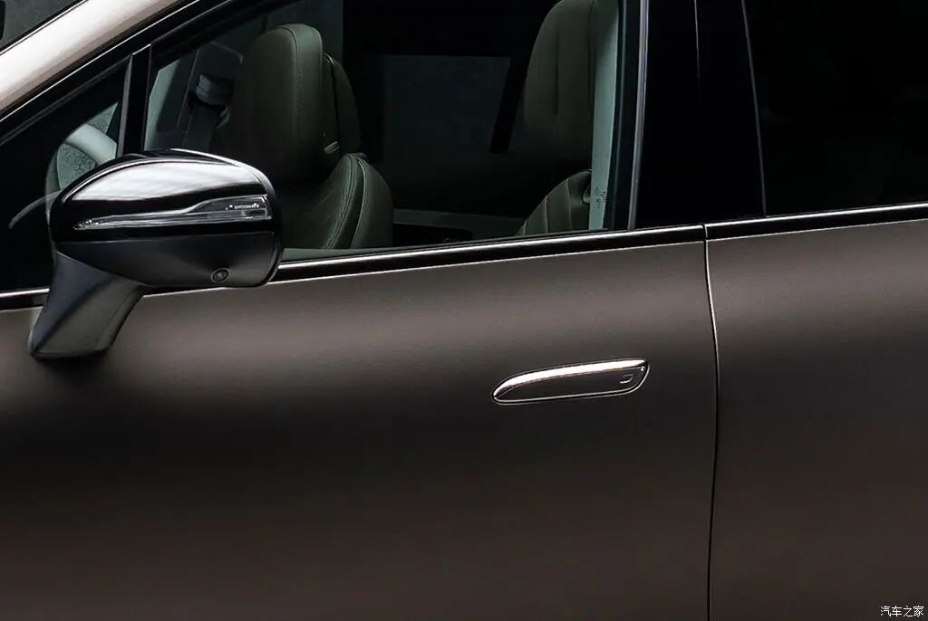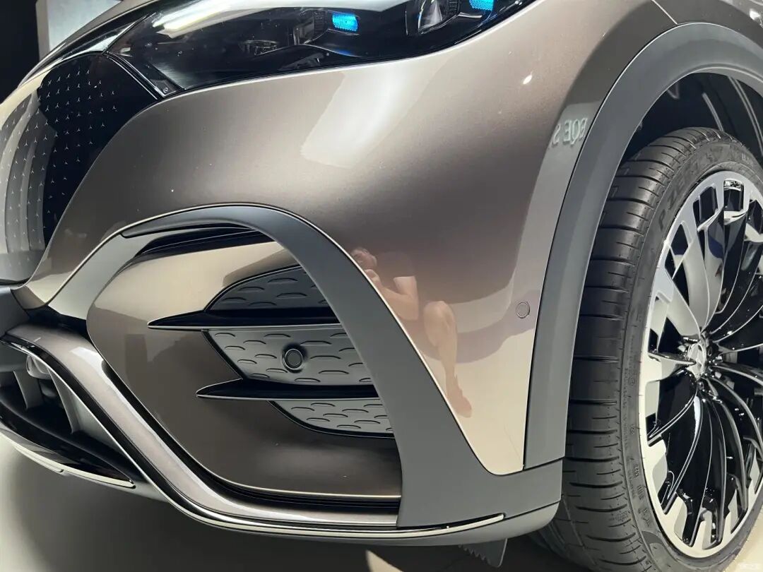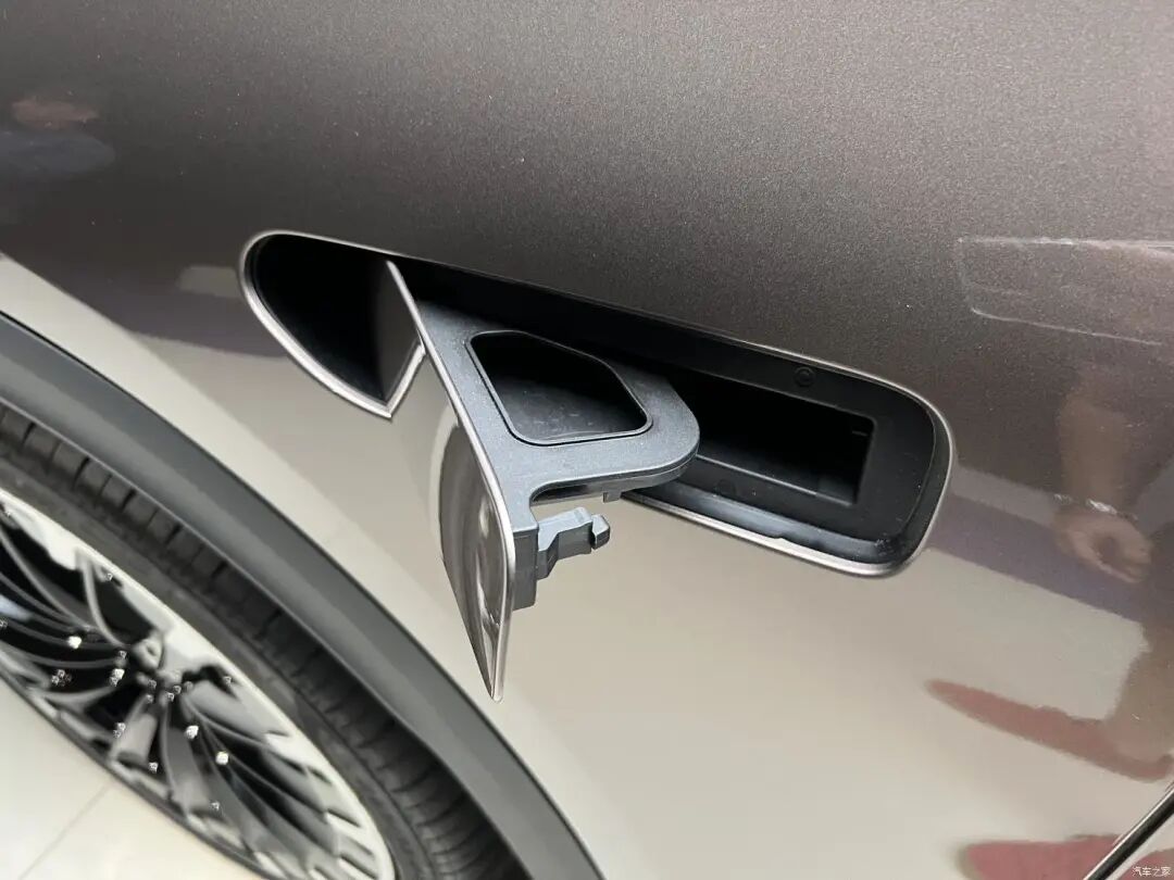 EQE SUV的前盖应该和EQE一样,都不能自行打开,所以就在左侧翼子板设置了单独的开口,以方便进行加注玻璃水等操作。车门拉手使用了隐藏式设计,外表带有一圈镀铬装饰。