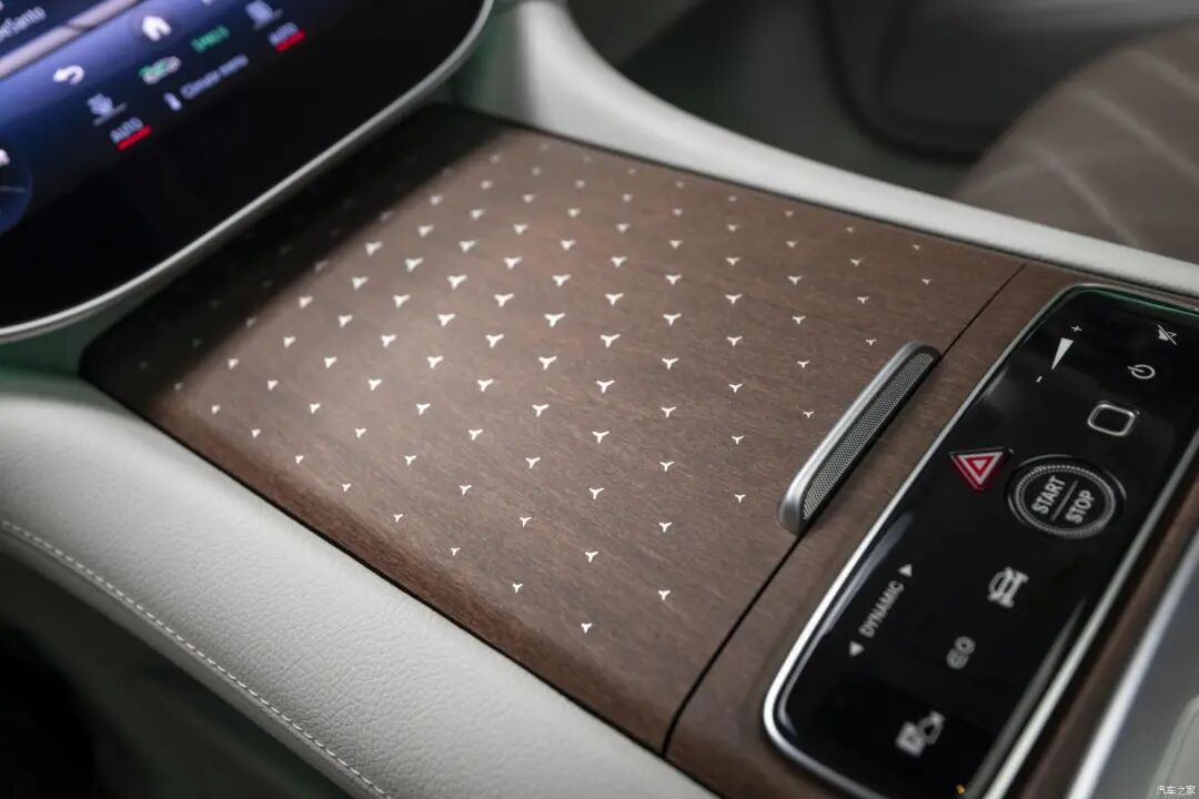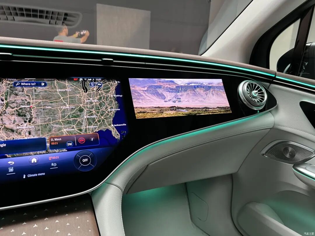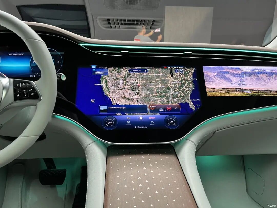 大尺寸的中控屏和副驾屏幕不仅担任着渲染车内氛围的重要角色,还是整台车的“功能中心”,绝大多数功能的控制都需要通过它来实现。显示界面很是精美,效果颇为细腻,配合最新的MBUX Hyperscreen车机系统,带来了美轮美奂的高级体验。