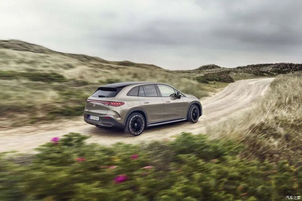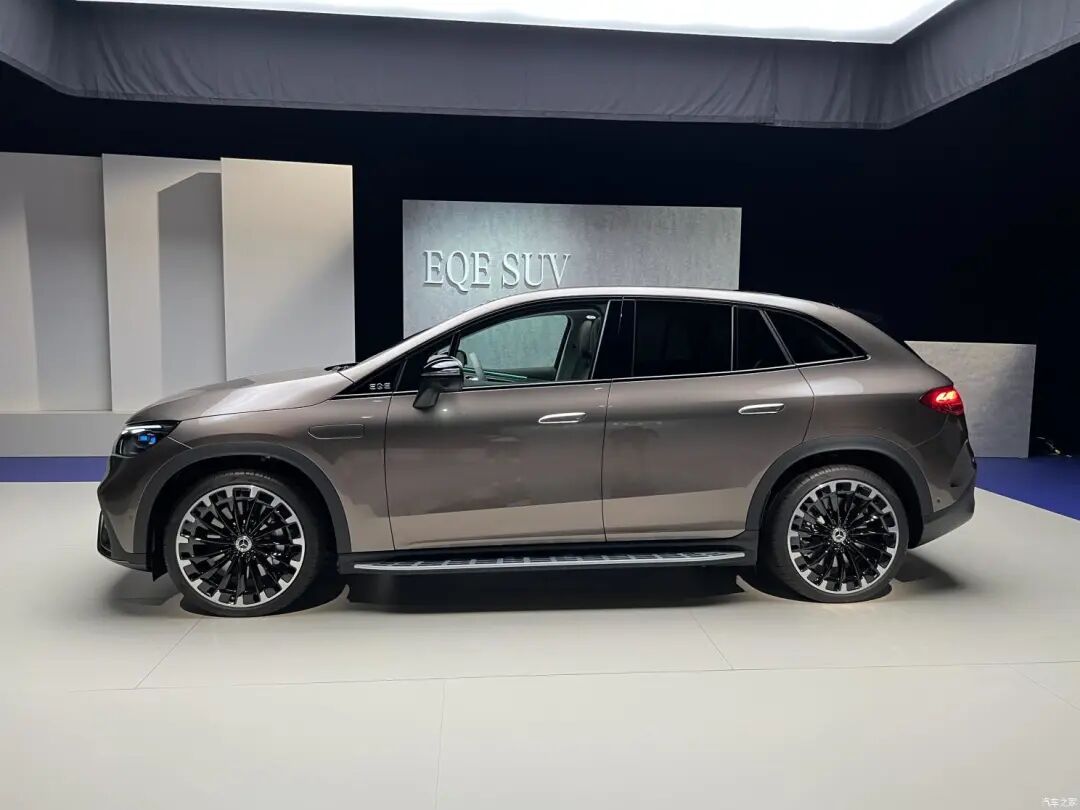 “弯弓式”设计在EQE SUV上有了新的演绎,前/后悬很短,A柱过渡平滑,姿态略高。车门下方的筋线和脚踏板的出现让它更显厚重与敦实。