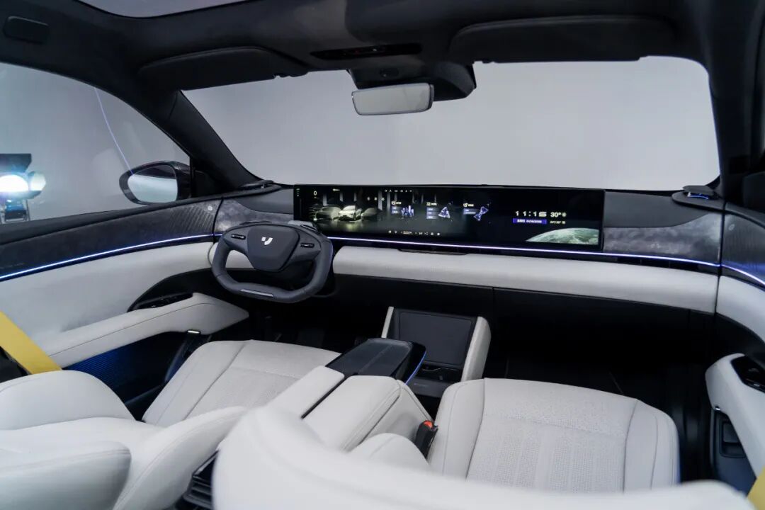 进入车内,整车内饰以白色为基础,几乎最大还原了概念车的内饰设计,中控搭载35.6英寸6K超清一体屏,基于高通8295计算平台,能够提供最佳的沉浸式3D视觉HMI和娱乐体验。