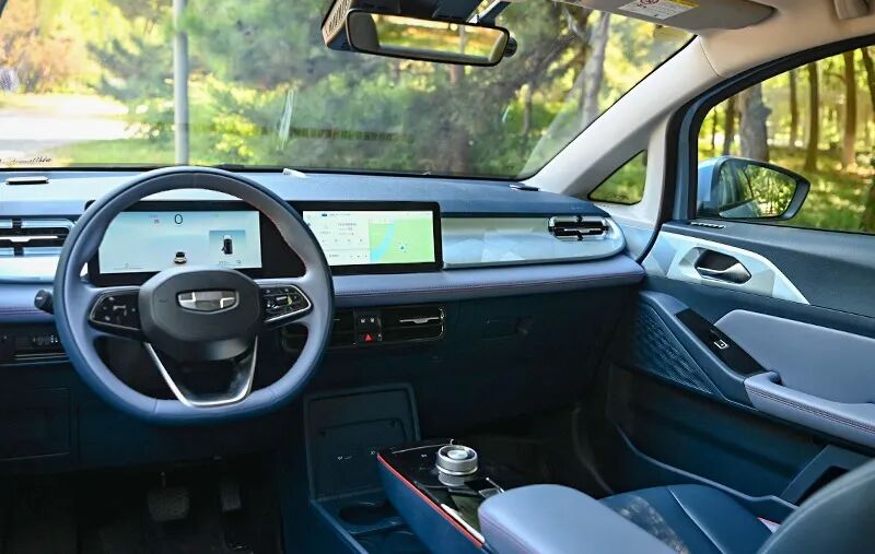 视线来到车内,几何E的内饰设计较为简洁,少量的物理按键兼顾一定实用性,激光镭射工艺银色饰板和浅色皮质为整体内饰氛围增添了几分质感,此外前排左右两侧的出风口被透明边框包裹,设计较为巧妙。