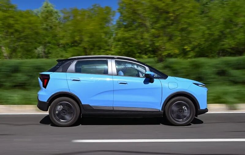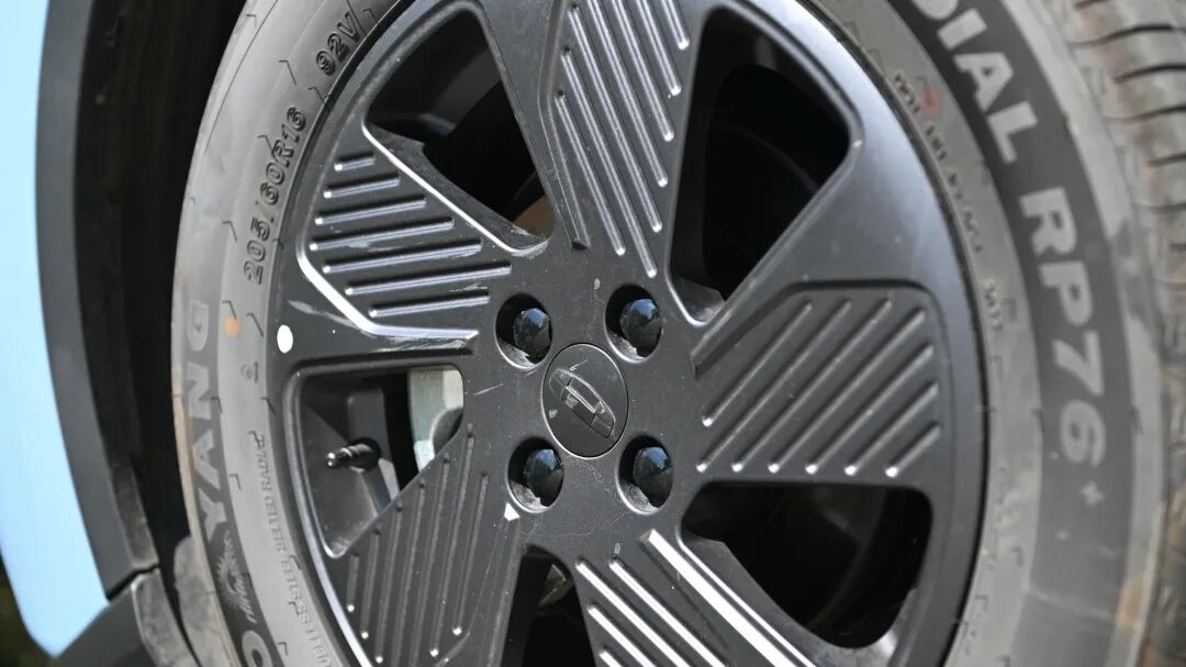 几何E的车长为4006mm、轴距为2485mm,数据放在小型SUV中表现中规中矩,新车侧面线条较为丰富,配合黑色车顶配色方案,在时尚感的营造上较为出色,本次实拍车型采用16英寸熏黑样式的半封闭轮圈,尺寸和样式都和整体车型调性较为相符。