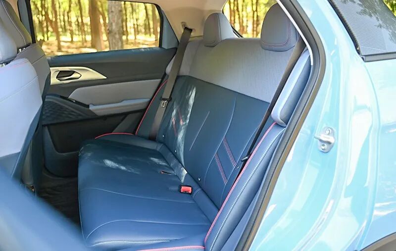 几何E前排座椅采用拼色方案,配合边缘处的亮色缝线,精致感营造得当,在座椅配置上全系均采用手动角度调节,新车后排采用一体式座椅,靠背内部填充较为饱满,舒适性不错。