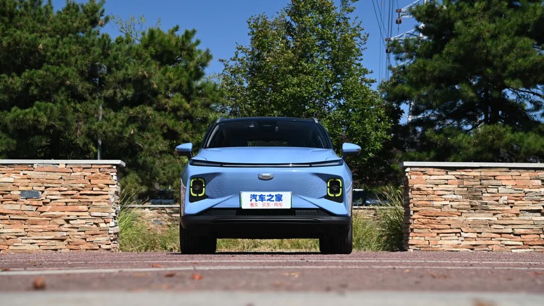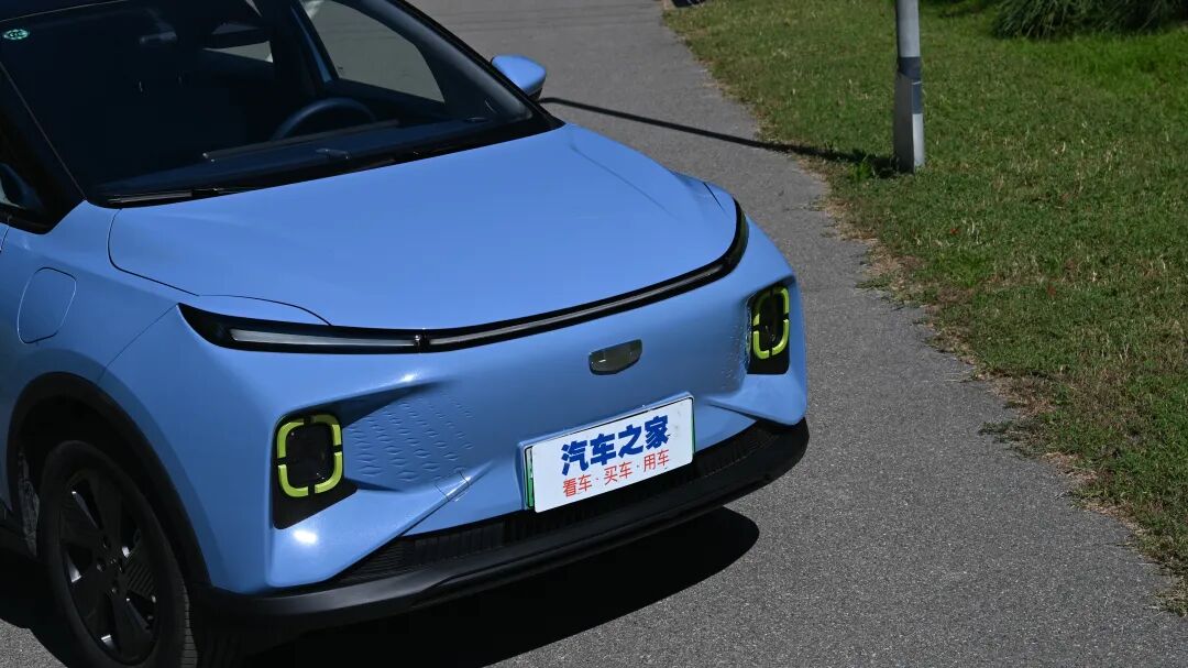 初次见到几何E,相信大多数人都会有种眼前一亮的感觉,除了抢眼的亮色涂装外,新车车头部分的设计语言非常激进,下包围造型类似獠牙般隆起,给人一股狠劲儿。